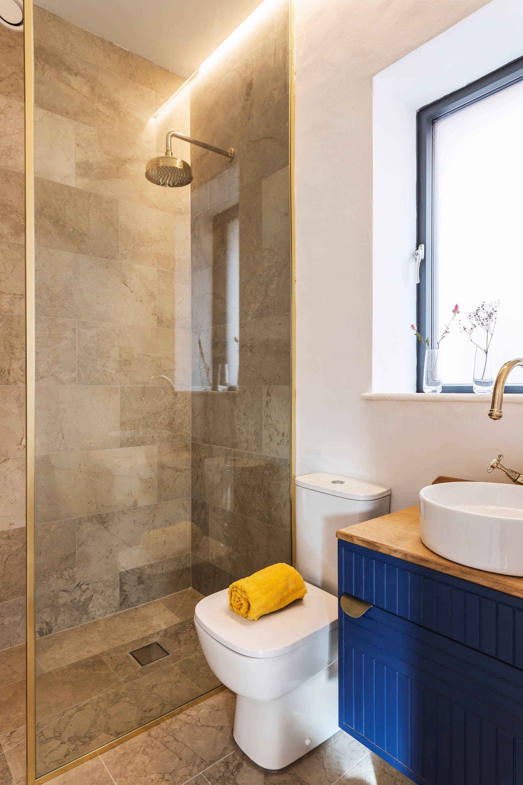 The en suite bathroom features a spacious shower lined with Tuscan marble tiles, which also cover the kitchen floor. “We wanted to show that an eco house could be stylish as well as practical,” Ellie says.