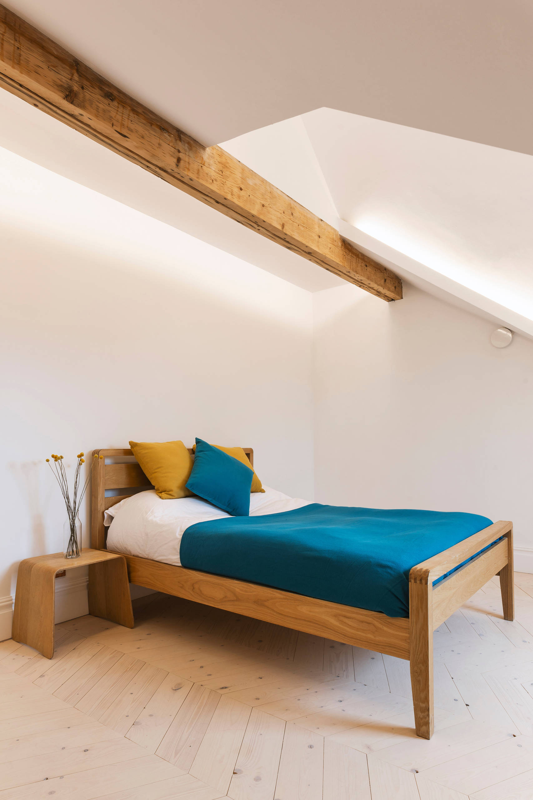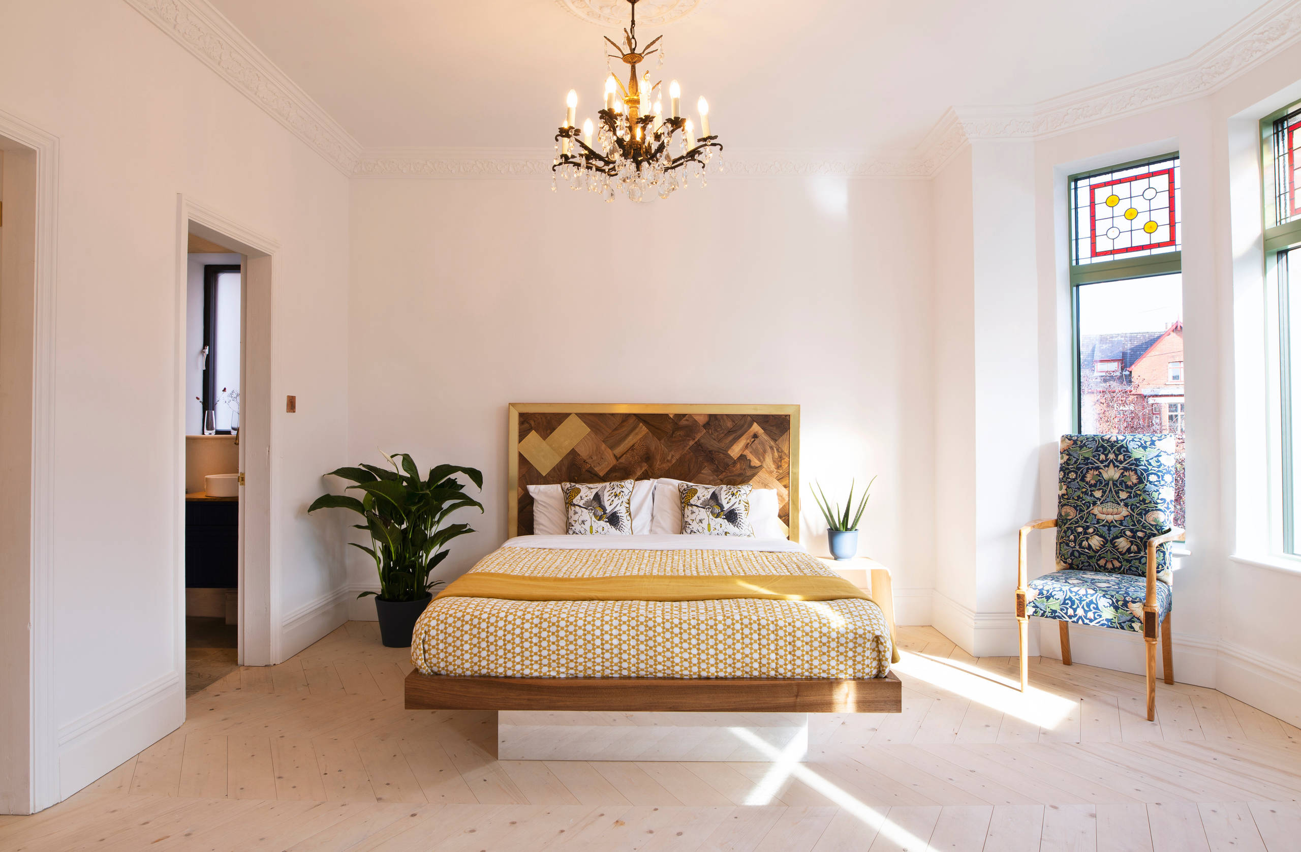 The original floorboards, treated with a breathable varnish, are laid in a chevron pattern in numerous rooms throughout the house.