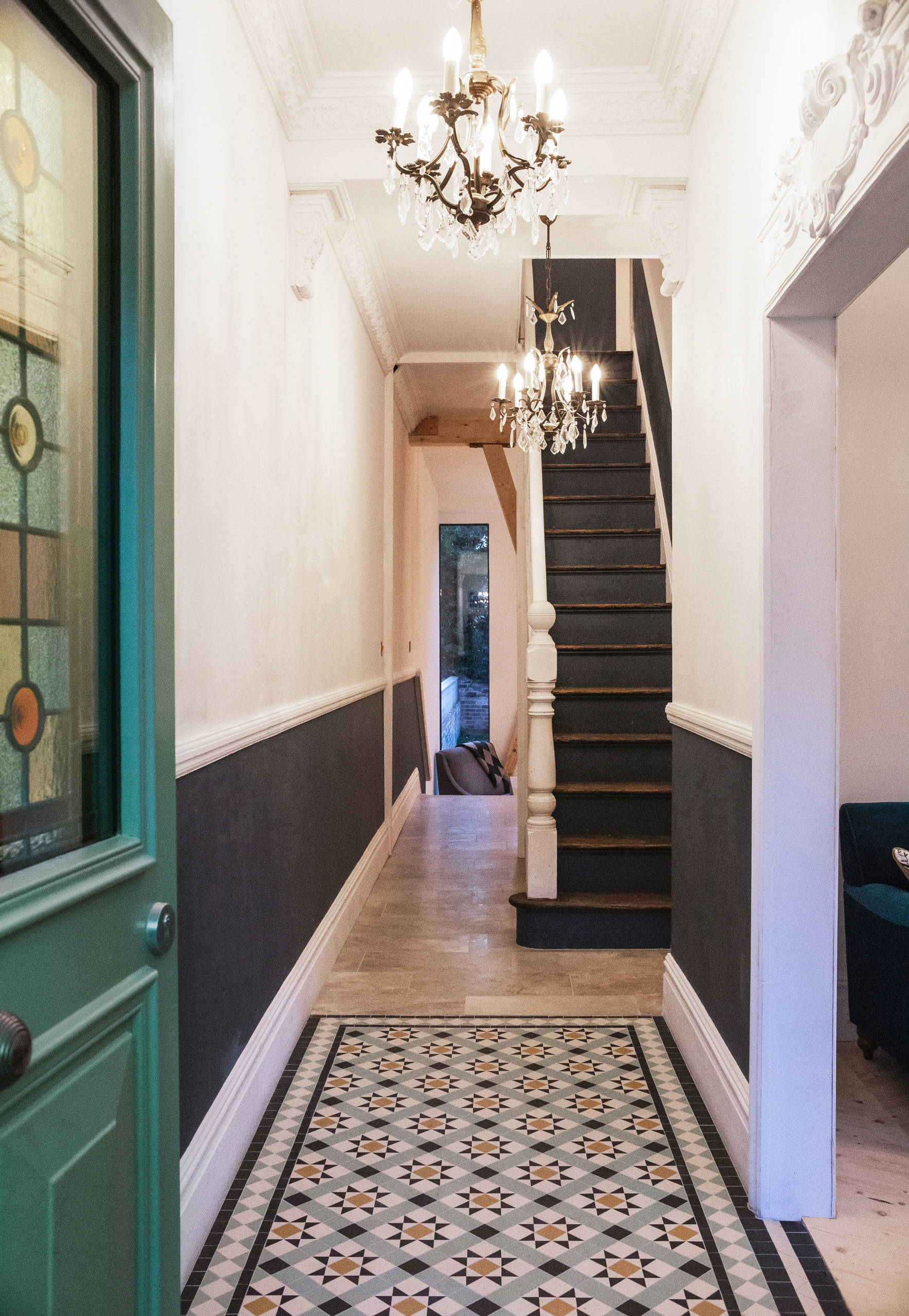 The team laid unglazed Victorian mosaic tiles along the front path and in the hallway, and installed custom plaster cornicing, ceiling roses and moldings throughout the house.