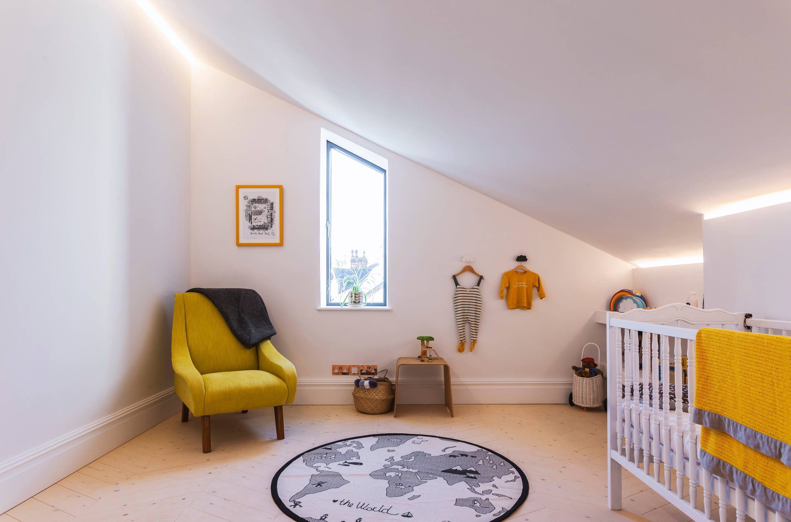 The walls in the nursery are painted with a product that’s a combination of lime and graphene (not to be confused with the graphite in your pencil), a new and extremely strong and durable material. It is also an efficient heat conductor, allowing it to thermally regulate the home.