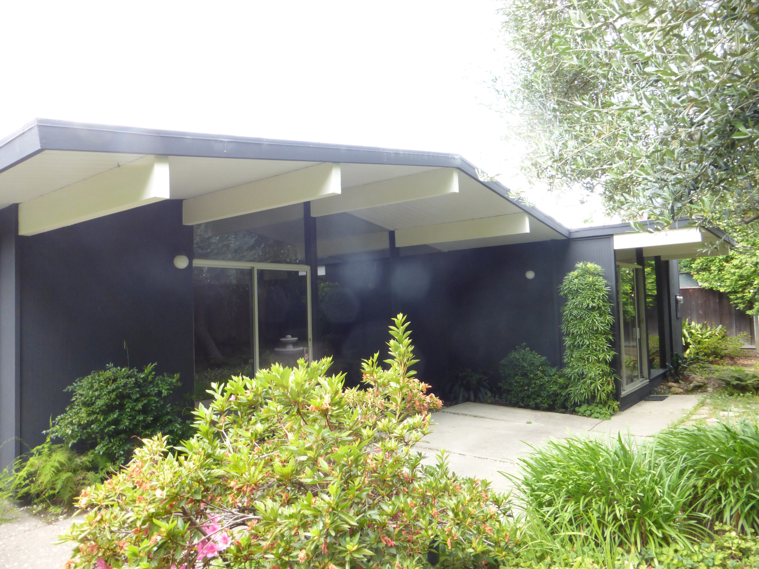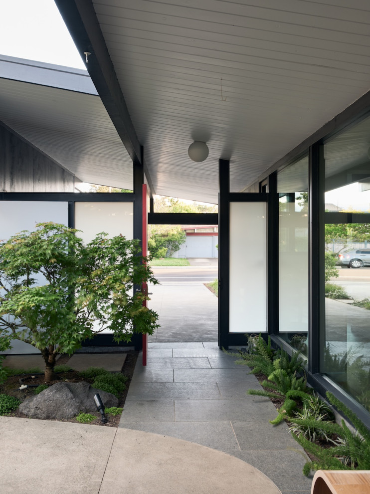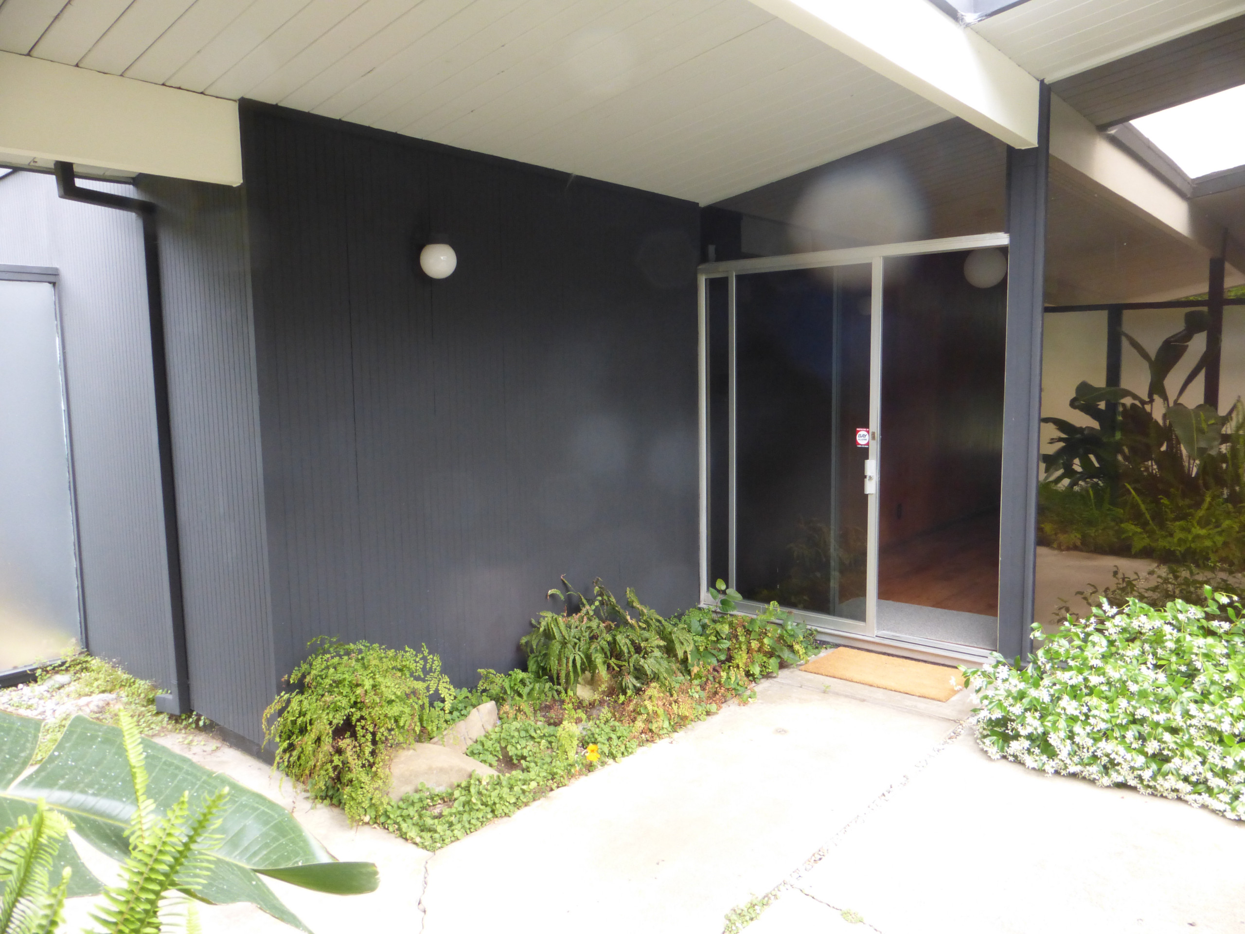 This house, which was built in 1959, is often referred to as a courtyard Eichler. It has a private open-air courtyard between the main house and a front fence and gate (the red door to the left of the garage in this photo).