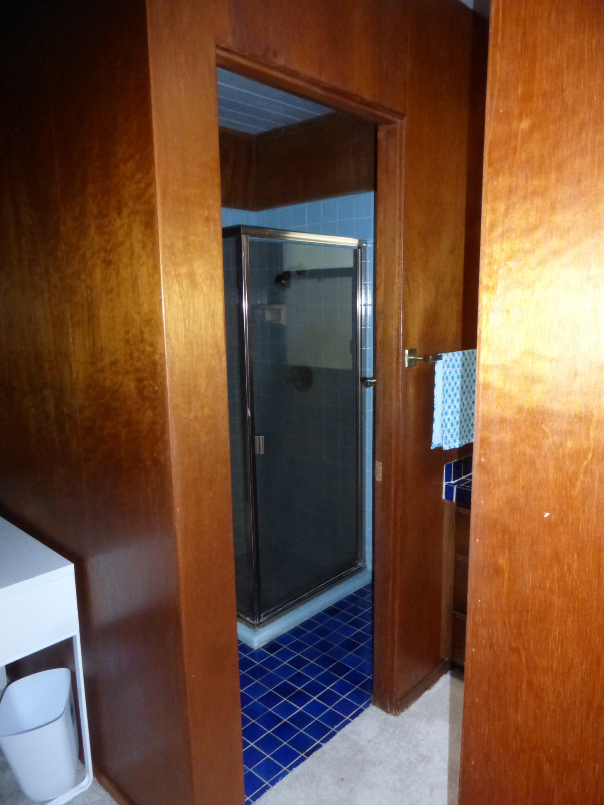 Before: The existing bathroom had a central sink with the closet area to its right and a shower stall and toilet to its left.