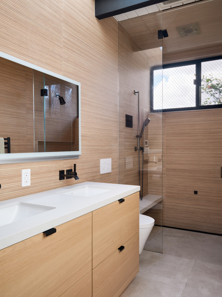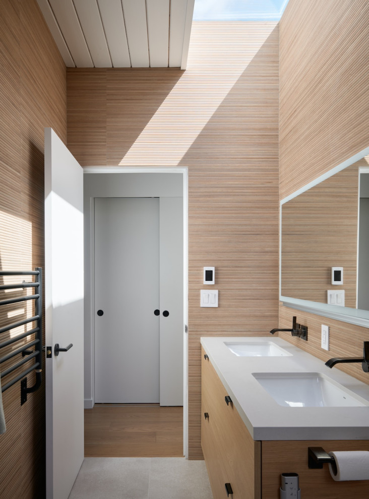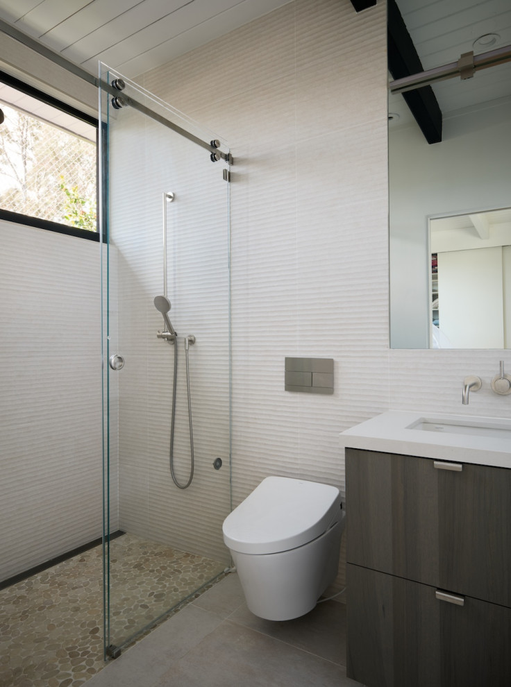 Klopf Architecture now offers interior design services but didn’t at the time of this project. The homeowners worked with designer Lucile Glessner when selecting and procuring light fixtures and bathroom materials, including the room’s textured porcelain wall tile.