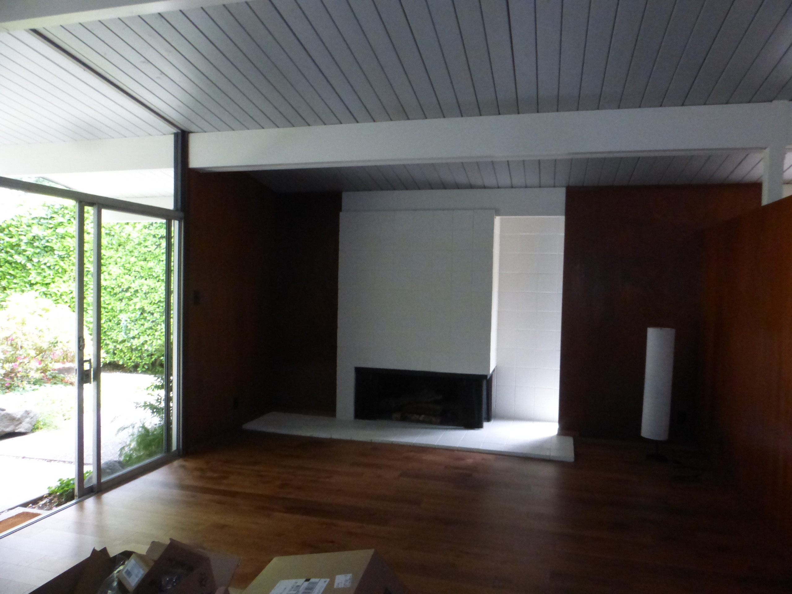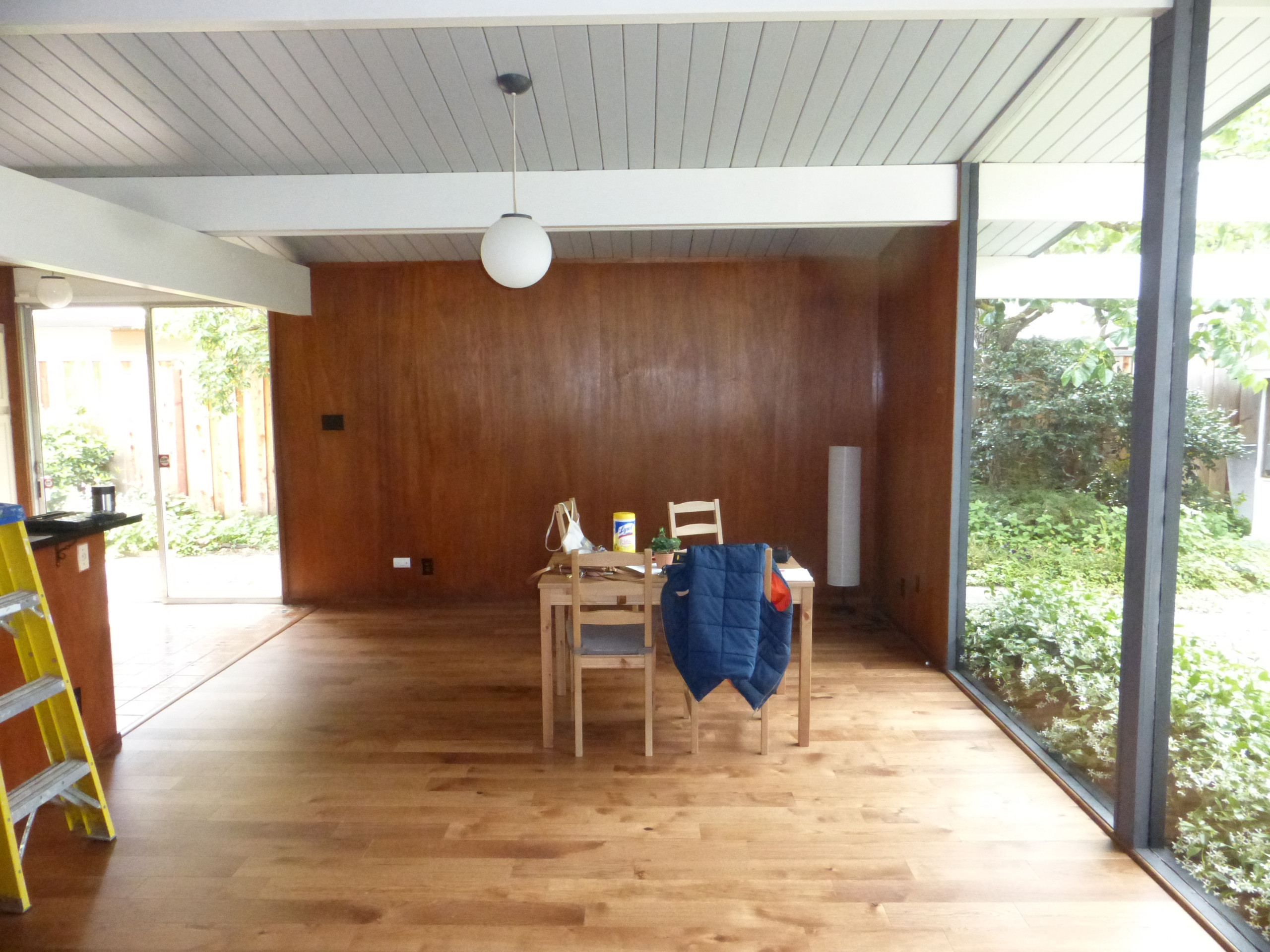 After: The owners wanted a fresh and contemporary look for the house. So the paneling was removed and the walls and original ceiling paneling were painted white. The ceiling beams were painted black for contrast. The flooring throughout the house is engineered hardwood.