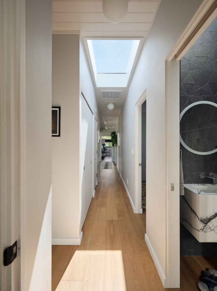 Looking down the hall from the primary suite, one can see additional new skylights that let sunshine pour into the expanded bedroom wing.