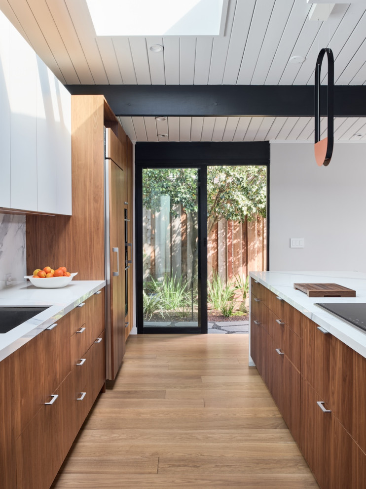 Klopf and Alexander removed the low-hanging beam and upper cabinets, for example, and they recessed the exhaust hood above the cooktop to maintain that openness. The new kitchen, which was designed by Klopf Architecture and constructed by Henrybuilt, has midcentury-modern-style slab-front walnut and laminate cabinetry and Porcelanosa countertops.