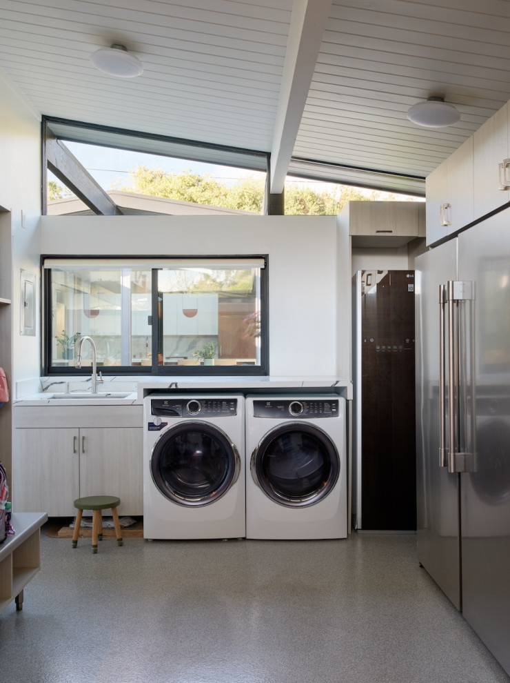 The garage serves as a mudroom, laundry area and office. The window above the laundry area (the same one visible from the exterior in the previous photo) looks out to the courtyard and into the house, which makes the spaces feel connected.