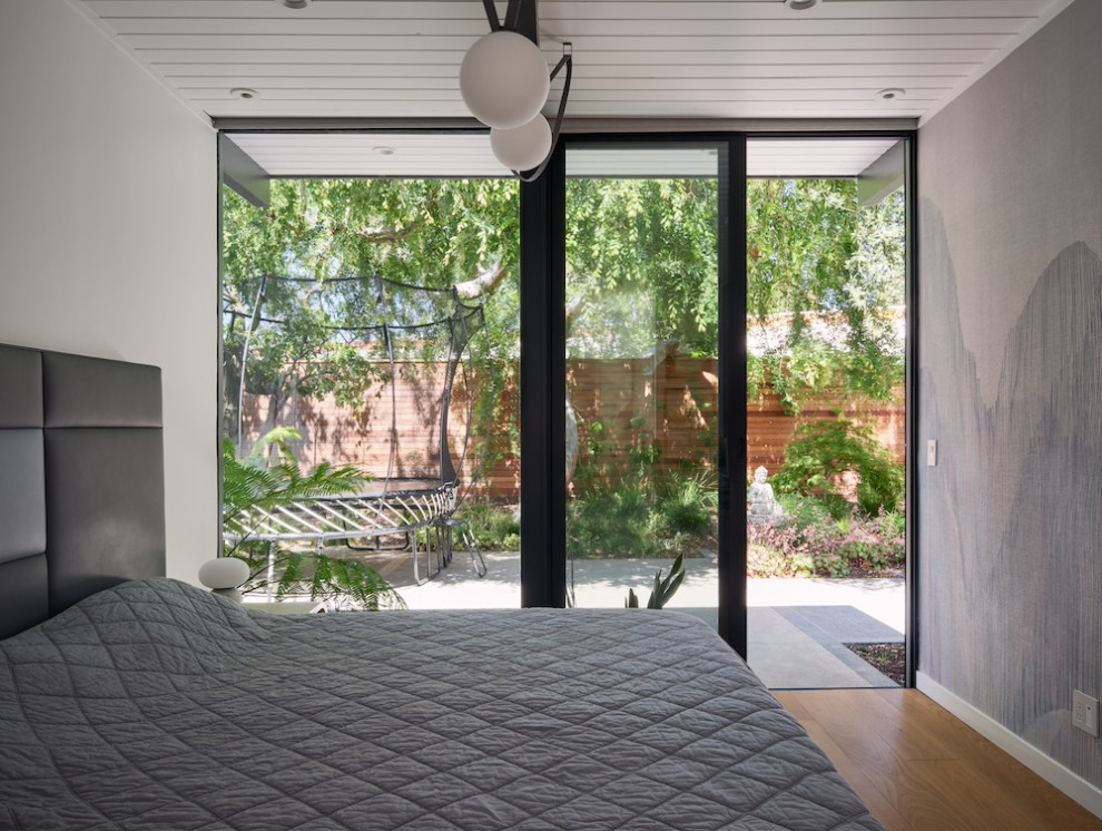 A new slider door opens to the enlarged patio. The backyard is very private (a common characteristic of Eichler homes), but Klopf and Alexander cut through the structural roof to add a recessed, motorized roller shade for light control.