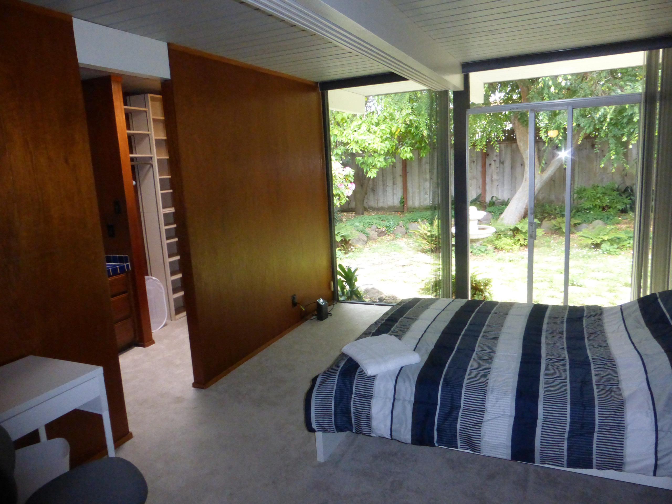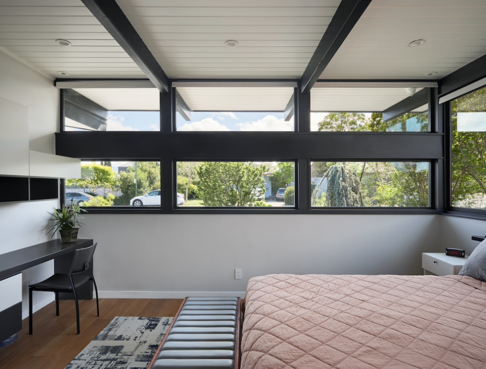 Here you can see the primary bedroom on the right, which was extended out into the backyard. The roofline on this side of the house was maintained but the height was raised from 8 to 9 feet, adding to the airy, spacious feel.