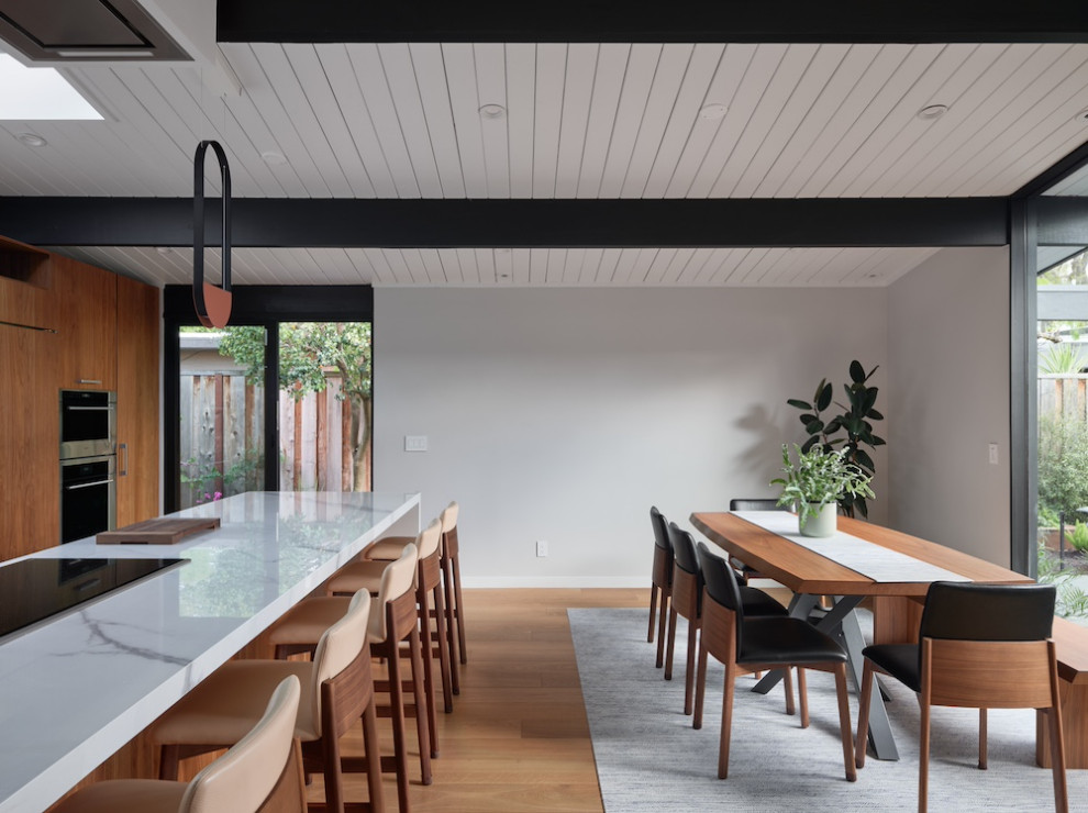 Originally, Eichler homes had minimal insulation and a radiant heating system built into the slab foundation. Over time, those heating systems often failed and proved difficult to repair. When upgrading this home, Klopf embedded a low-profile forced air conditioning system in the new roof insulation, powered by an electric heat pump. (The house is equipped with solar panels too.) The larger circles in the ceiling pictured here are can lights. Beyond them, the smaller circles are the discreet air conditioning and heating ducts.