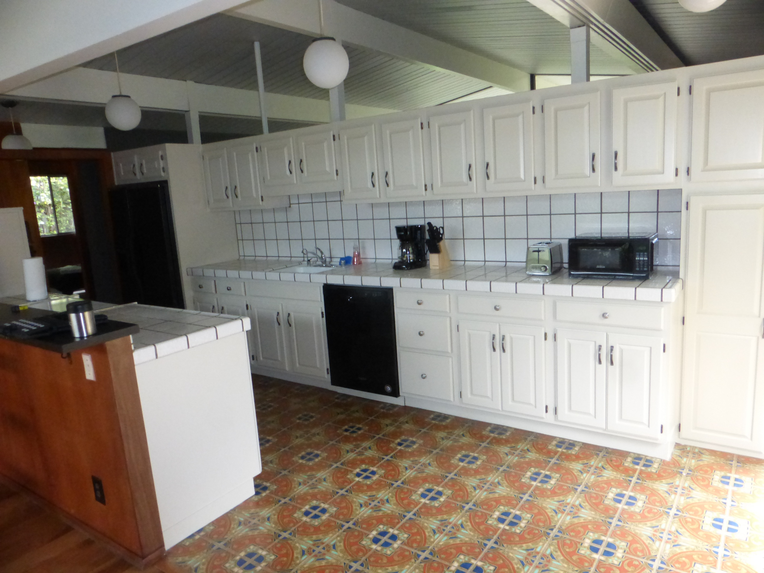 Before: The existing kitchen’s design looked out of step with the home’s architecture. A low-hanging beam and upper cabinets (left) above part of the peninsula blocked the sightline to the living room and out to the courtyard.