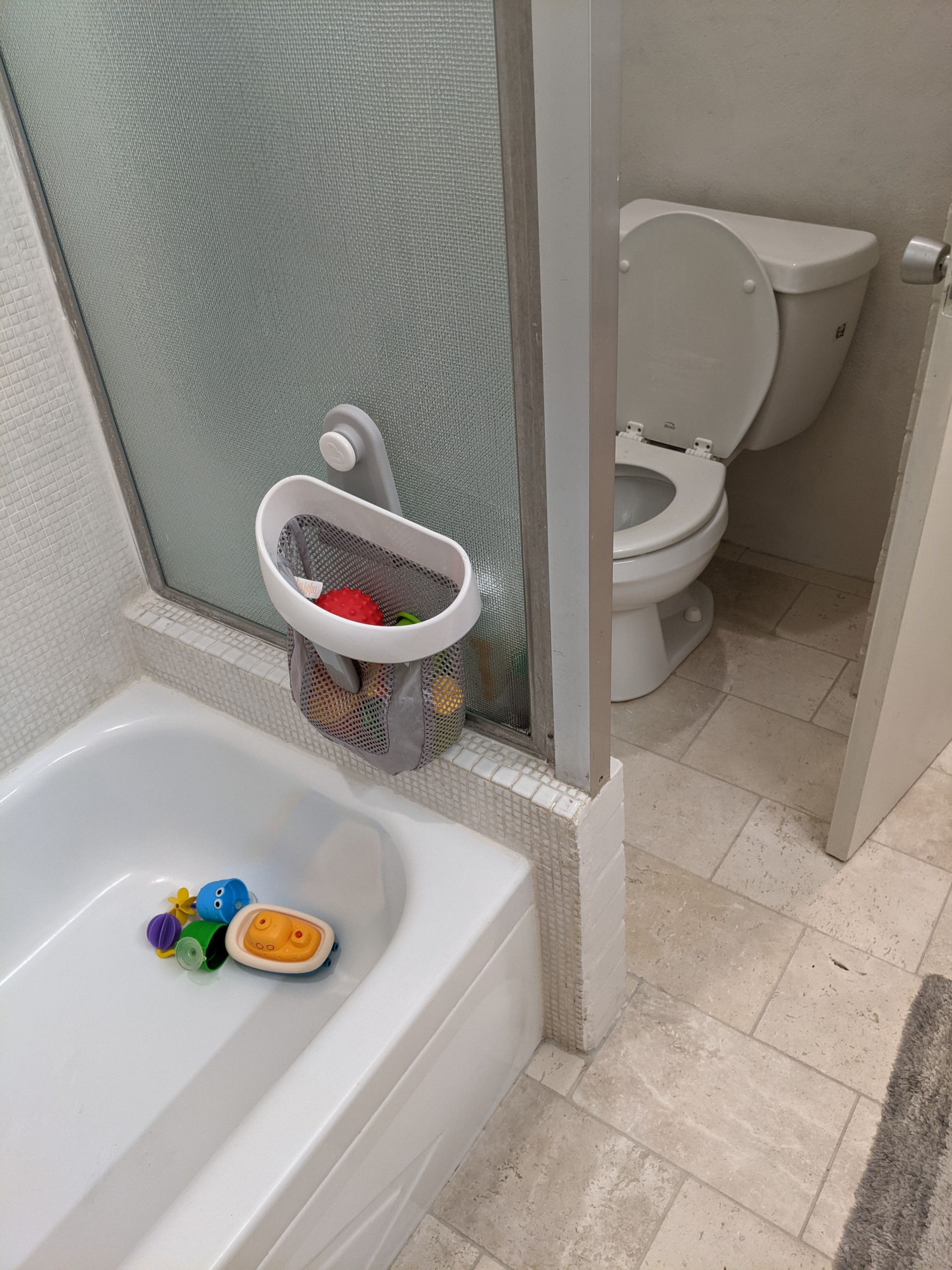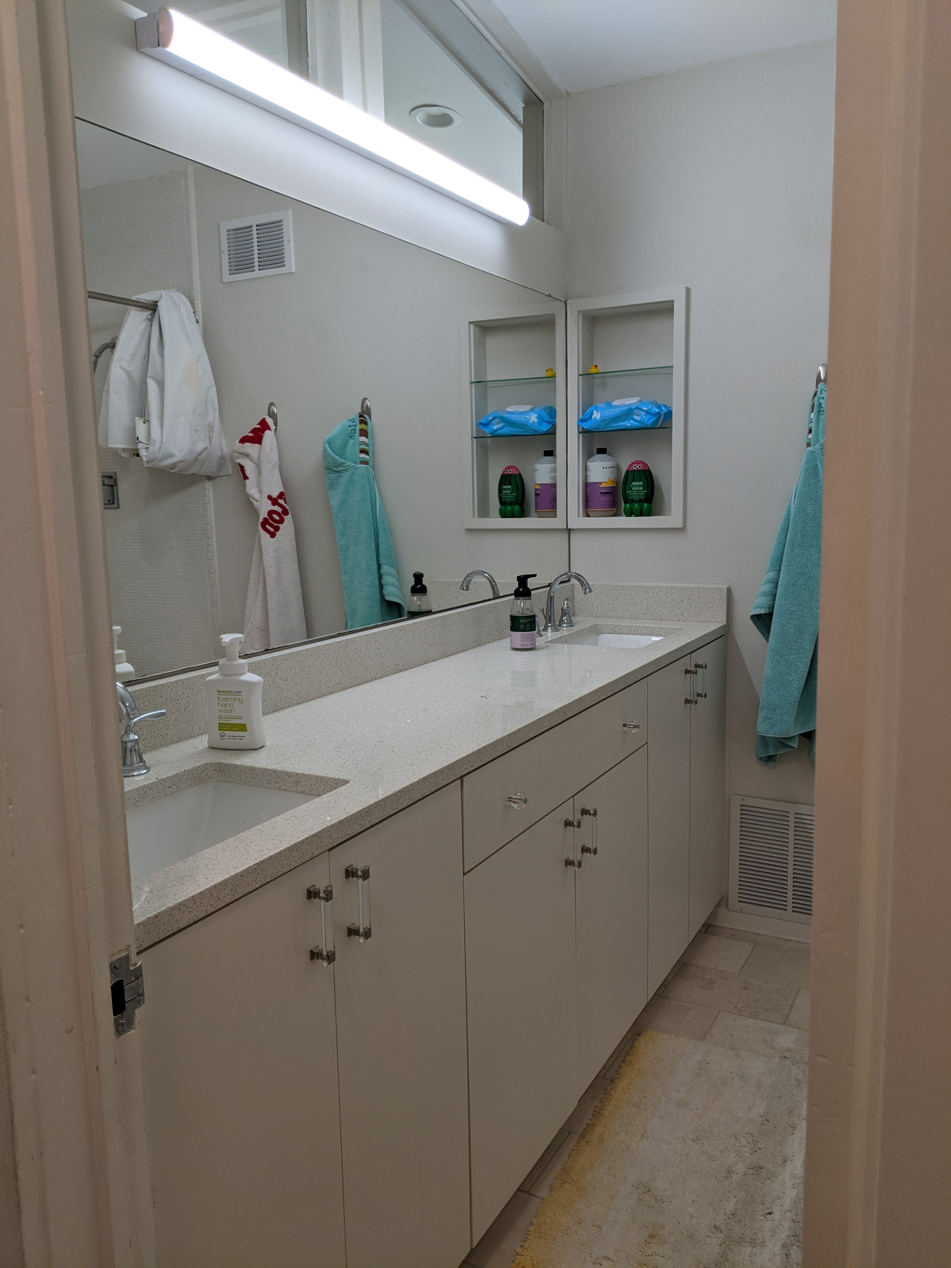 Before: The kids bathroom had a 4-foot bathtub and a toilet in a tight space with little room for knees.