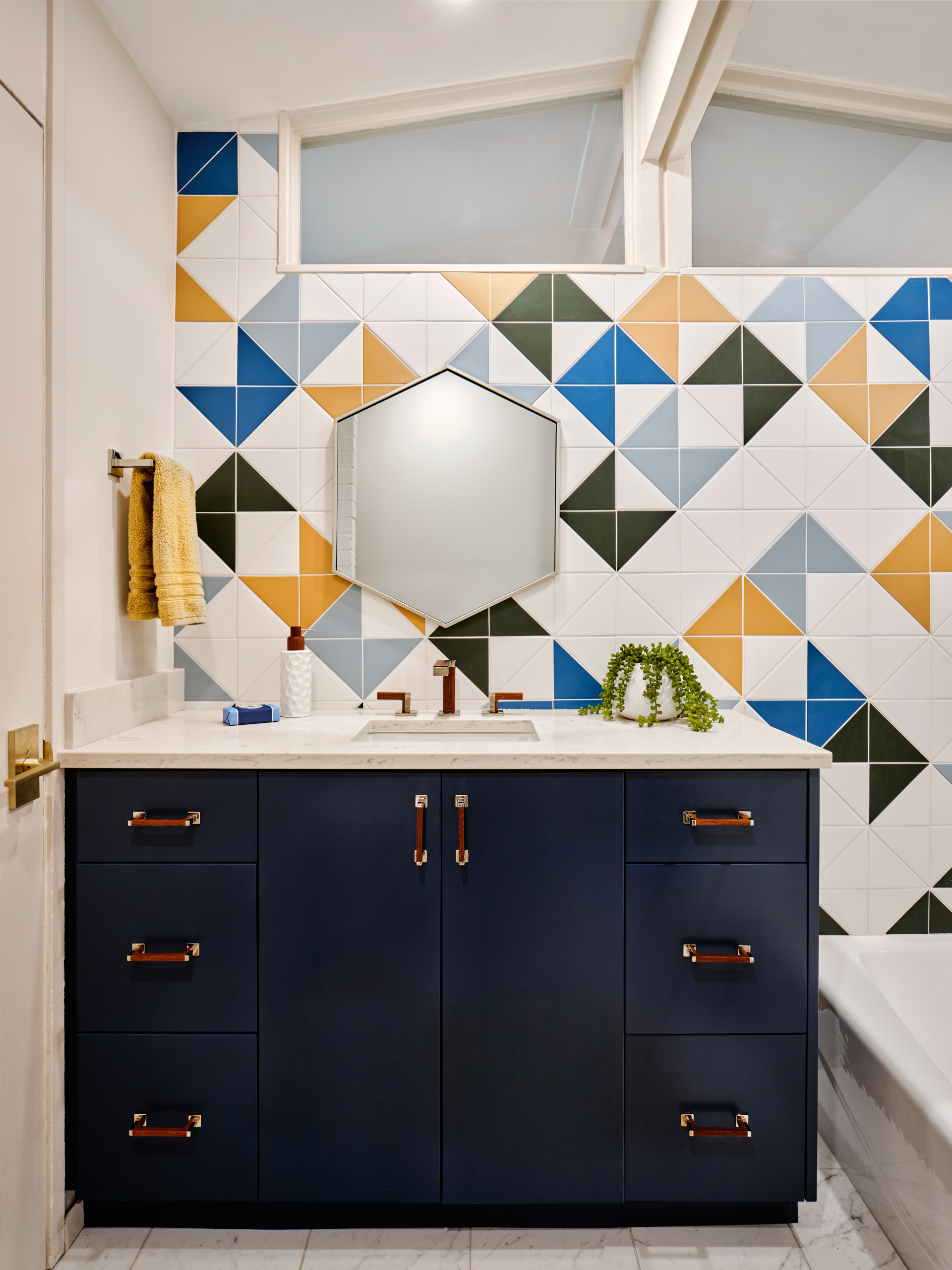 After: Valdez’s team kept the trapezoidal windows and installed an attractive new vanity in the space. It incorporated modern touches including geometric tile and mirror and wood and chrome sink fixtures. Reconfiguring the space by turning the bathtub 90 degrees allowed it to install a standard 5-foot bathtub and create more space for the toilet. The colors and fun design exemplify the home’s new look.