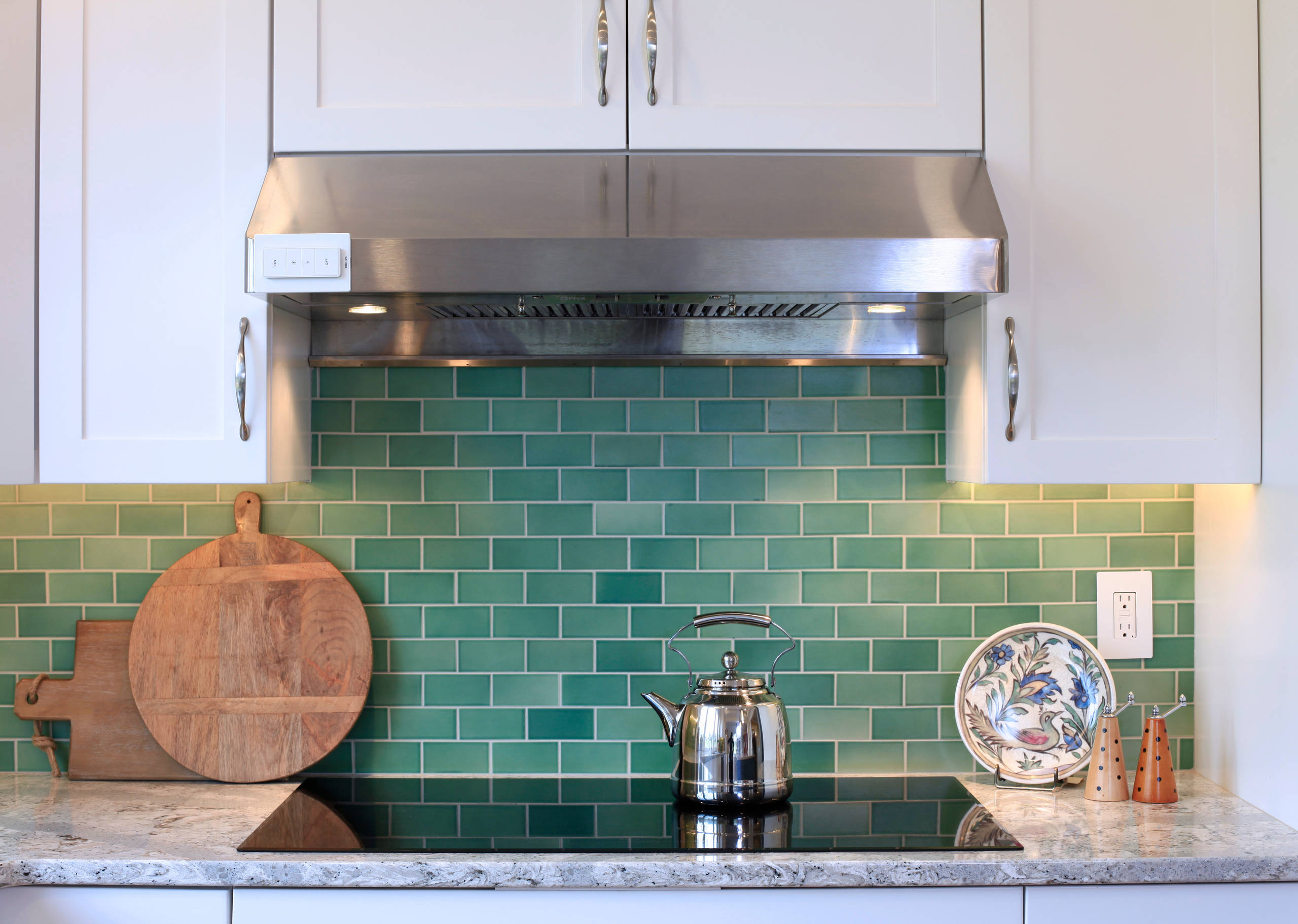 Backsplash. The backsplash is handmade tile from Heath Ceramics. It is two-by-four-inch subway tile in Meadow Green.