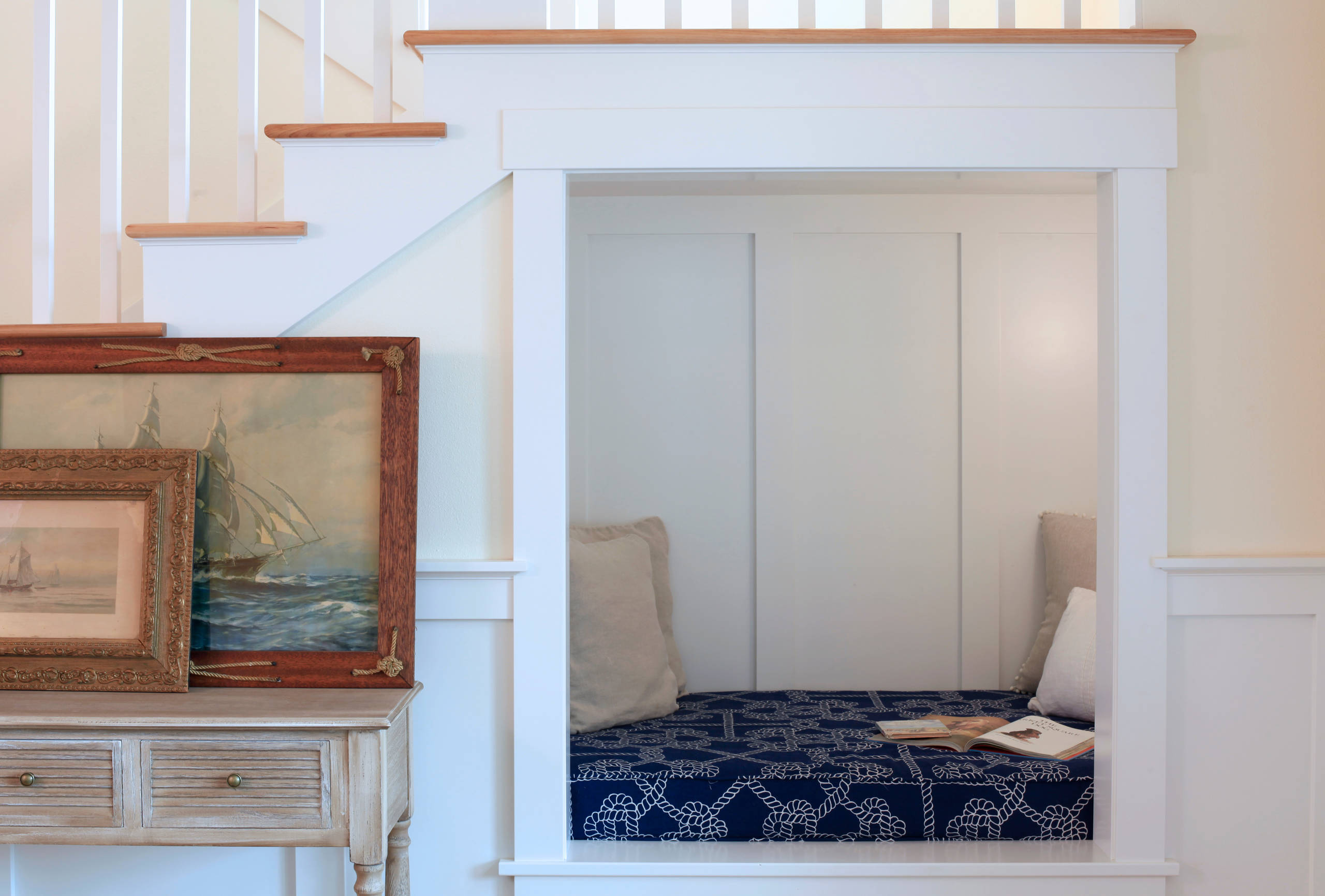 Outfitted with Craftsman-style millwork, lighting and a cushy mattress, it’s a favorite spot for the kids to hang out or have mom or dad read to them, or for anyone in the family to sneak off for a nap. Julie found a nautical fabric to cover the custom foam cushion.