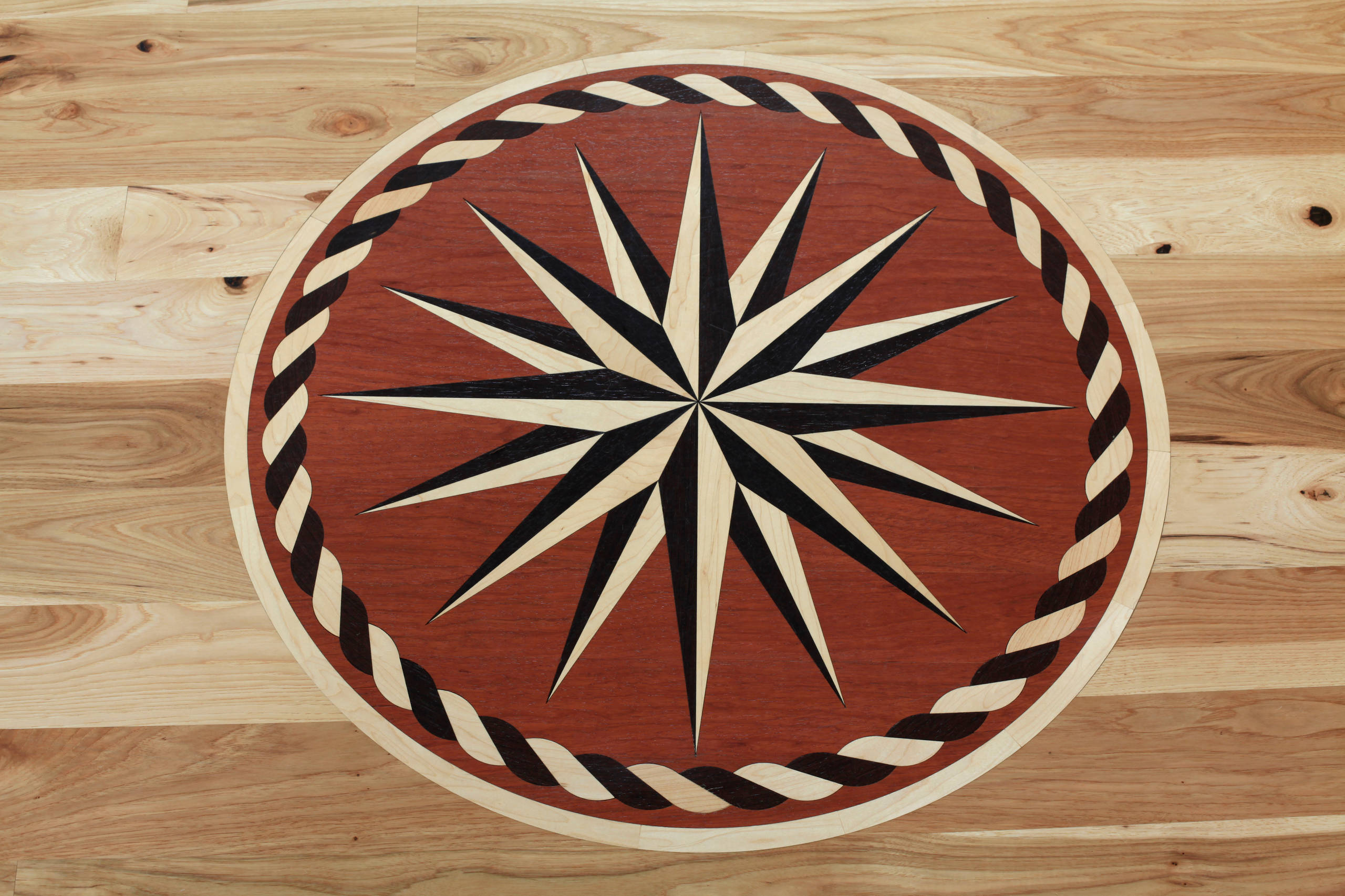 Interior style. In addition to Craftsman and Mission-style inspirations, studying Chapin’s coastal cottages gave Julie the idea to add nautical touches to the home. This wood inlay compass rose sets the tone between the entry and the living room. Carl used his old Boy Scout compass to make it point true north.