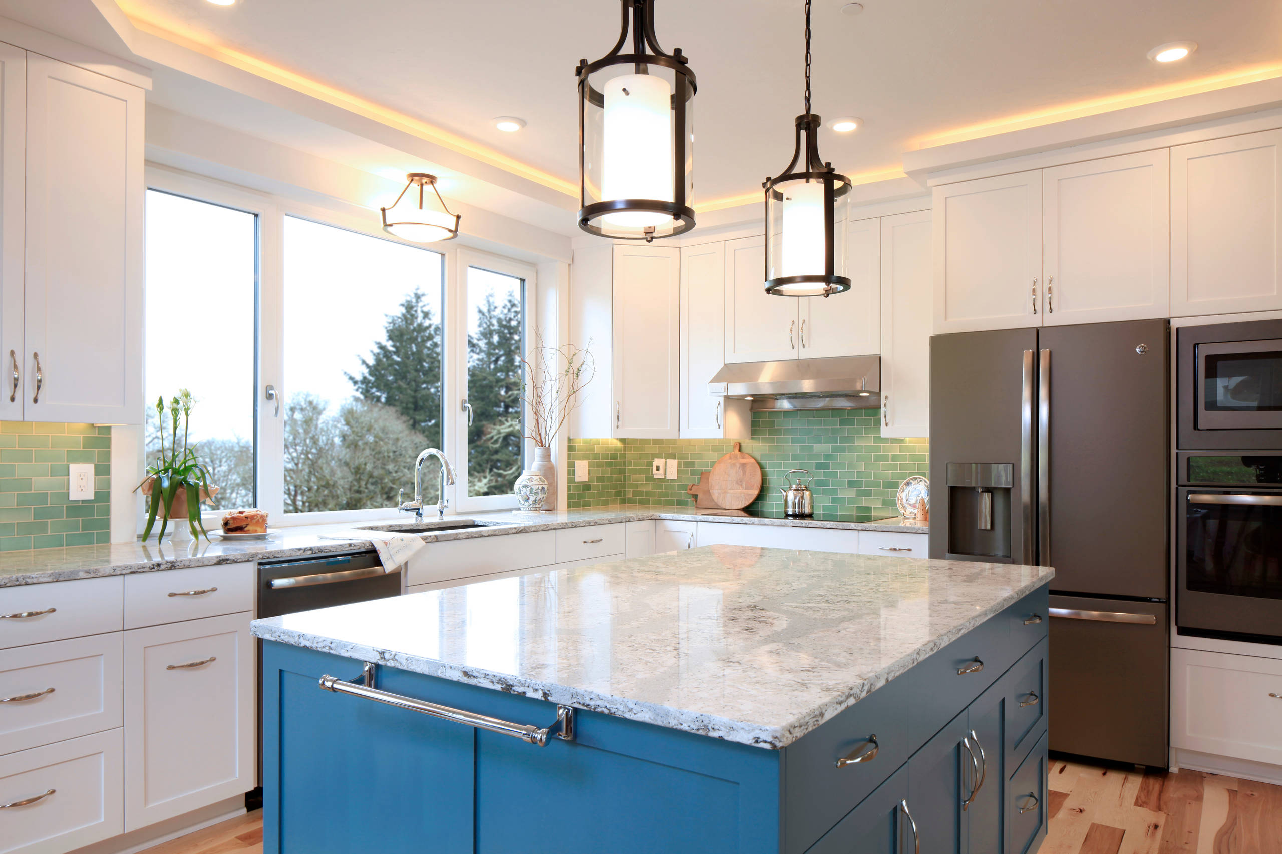Lighting. Large windows over the sink let in the daylight, and their tilt-and-turn functionality lets in the fresh air. And the lighting underneath the kitchen island, under the cabinets and in a recessed cove in the ceiling are Phillips Hue LED tape lights that can change color via an app.