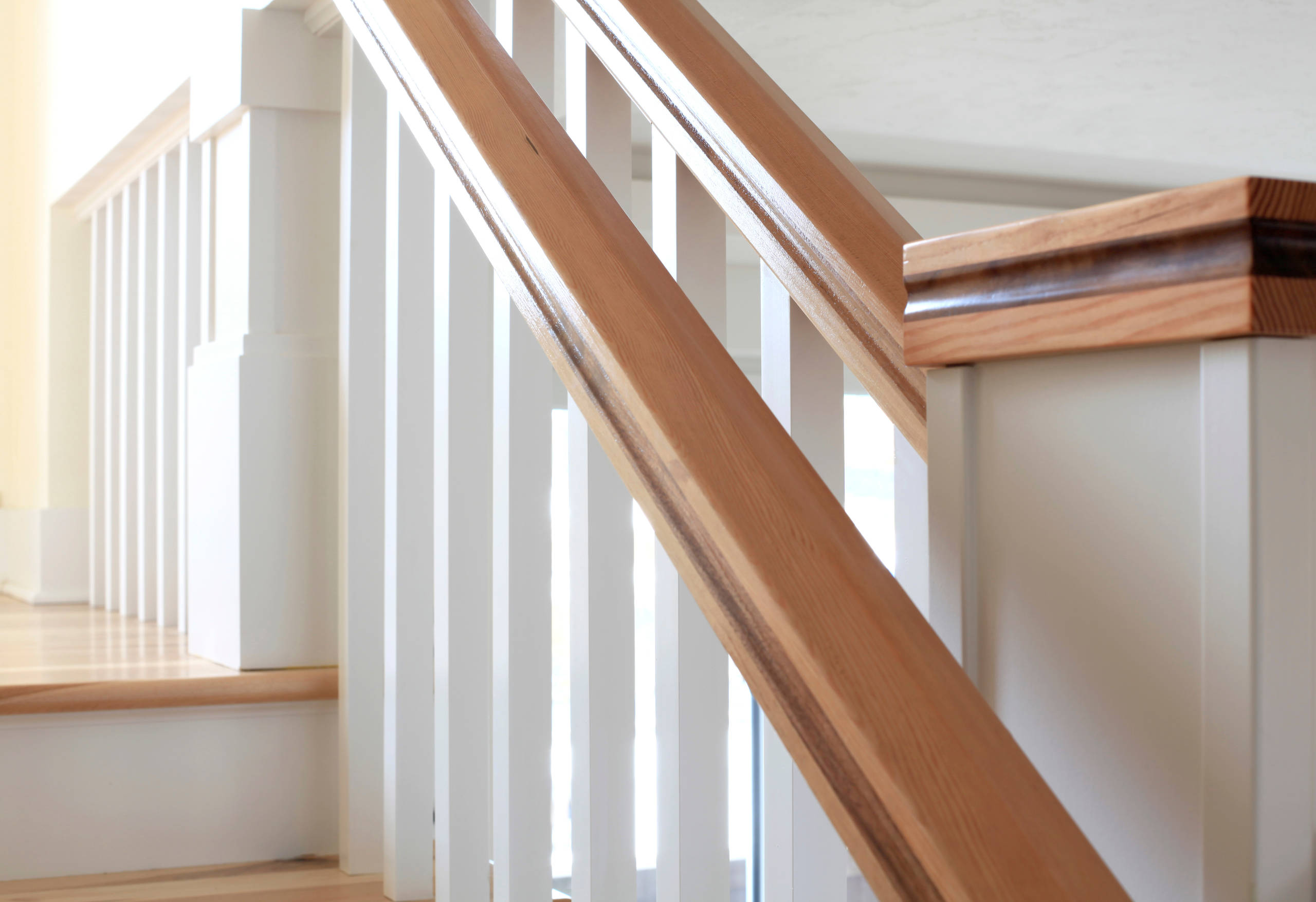 Staircase. The posts and handrail on the staircase nod to the kinds of carpentry details seen in a Craftsman-era home. The railing is a clear vertical grain fir on the top and bottom with black walnut in the middle. This was accomplished by sandwiching the three pieces together, laminating them and then using a router to create the recessed detail.