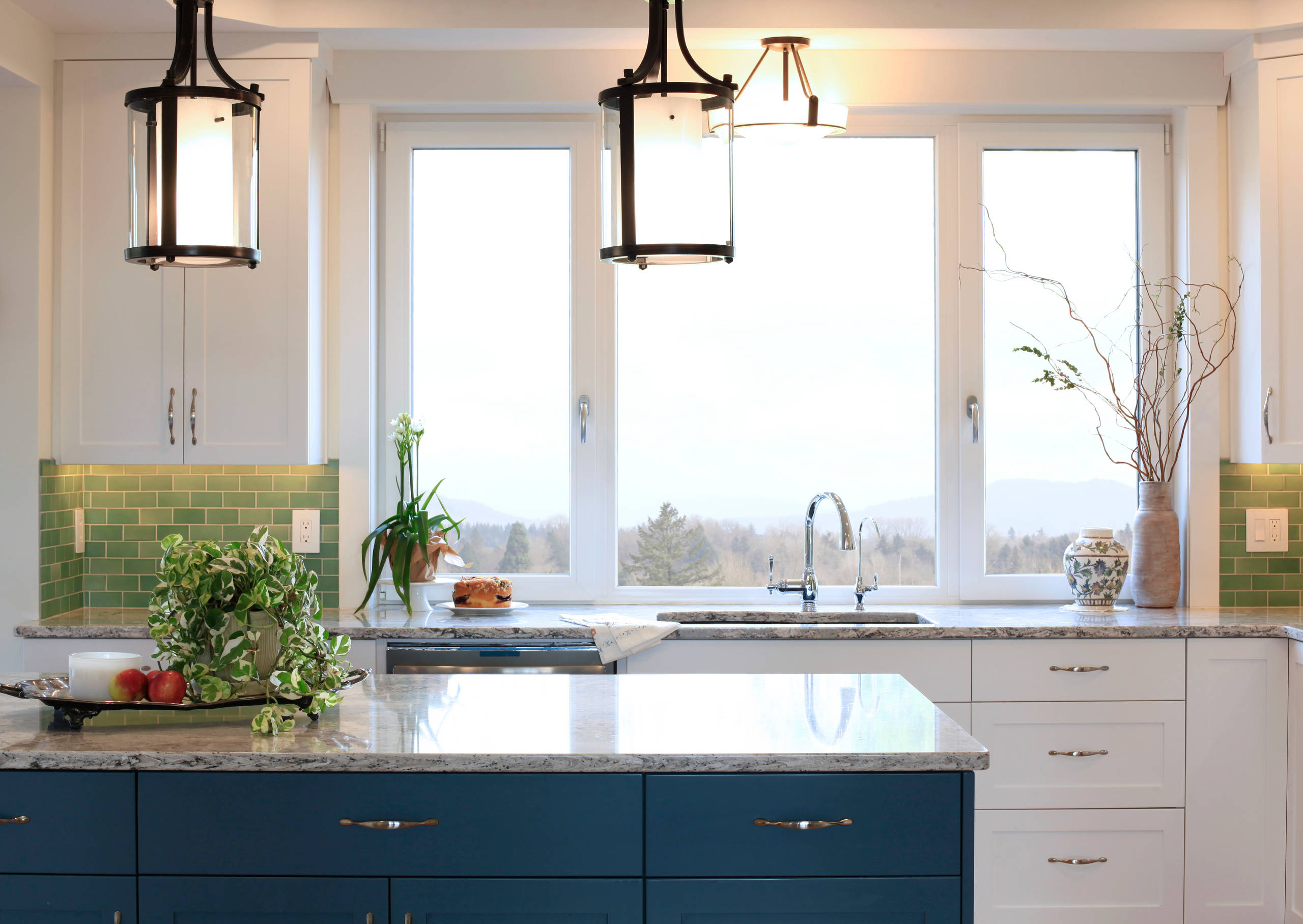 Island paint: Labradorite, Sherwin-Williams; countertops: Summerhill, Cambria; browse more quartz countertops