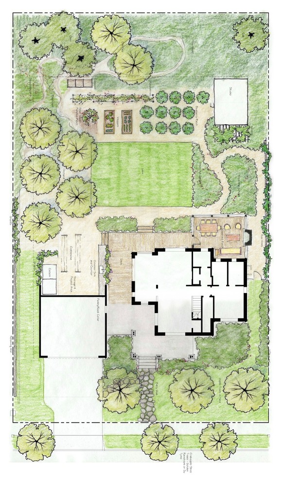 The backyard is not just a visual feast, it’s full of edible plants. Here’s the landscape plan from Lovinger Robertson Landscape Architects. Plants include peach, apple and cherry trees, raised vegetable beds, blueberry bushes, herbs, archways for pea vines, trellises for kiwis and grapes and more.