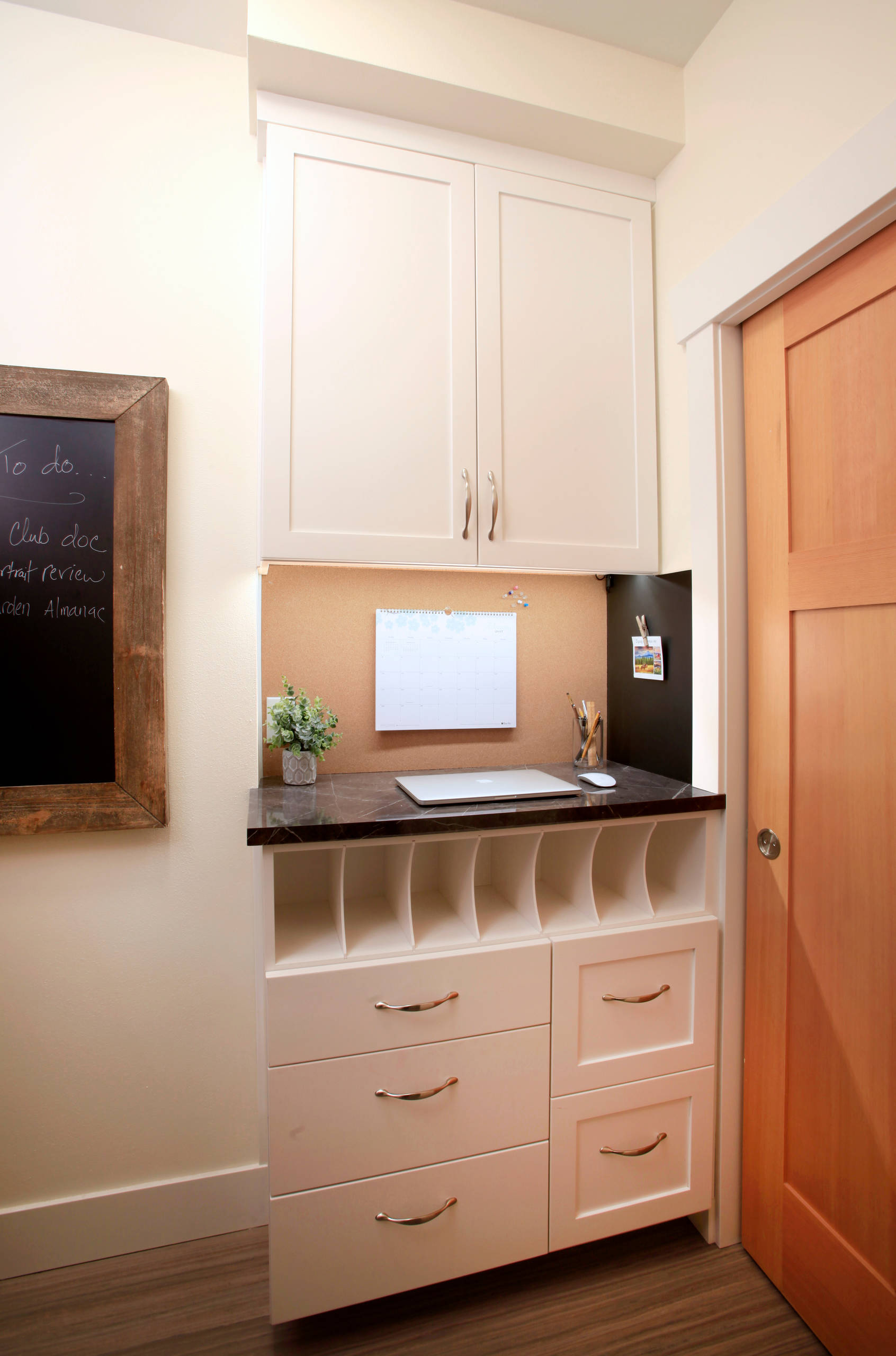 Laundry room. Much like the entry, the laundry room has handy built-ins that help keep the family organized. This area has a command central station with corkboard for schedules, slots for mail, room to charge devices and drawers for storage and organizing.