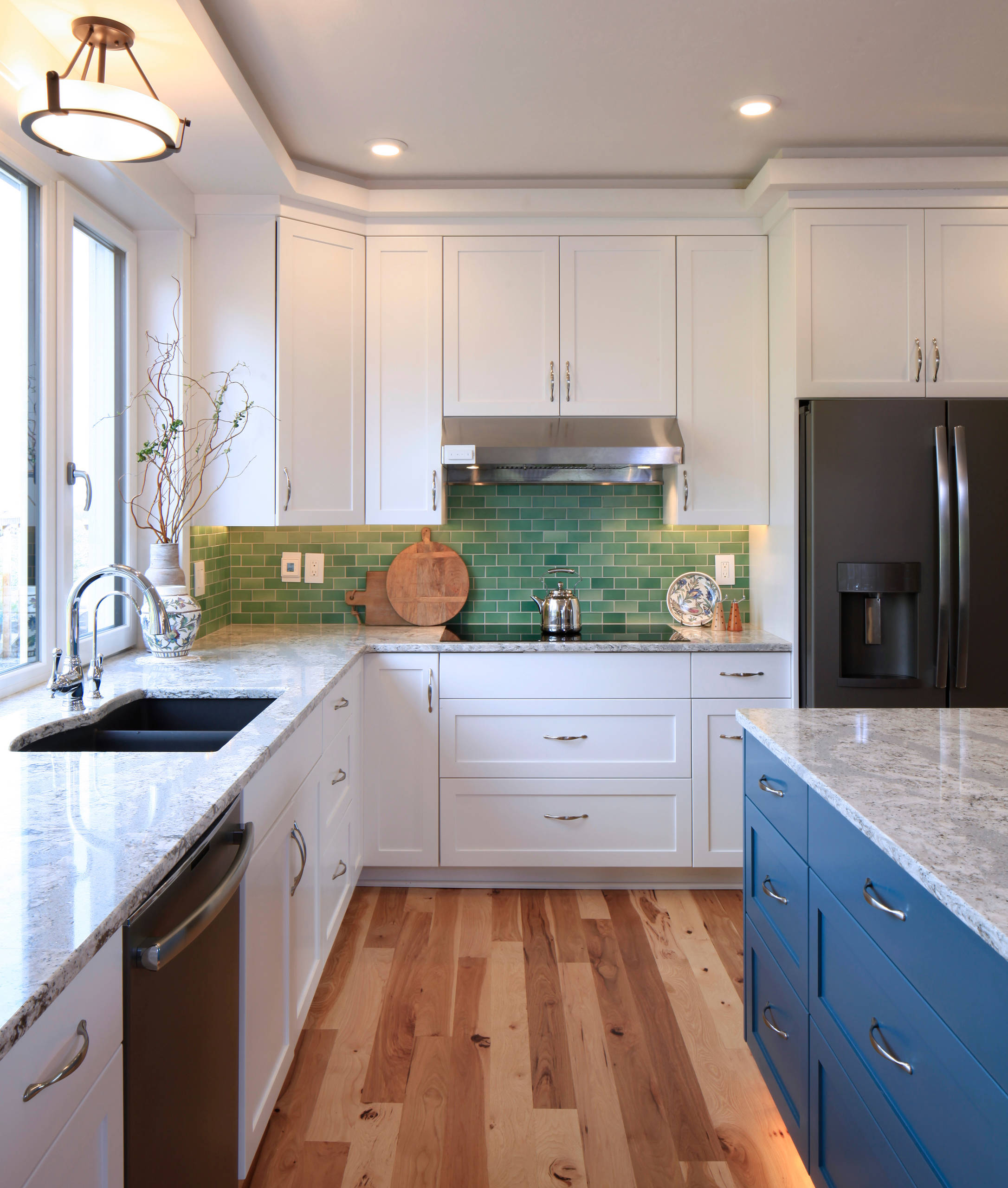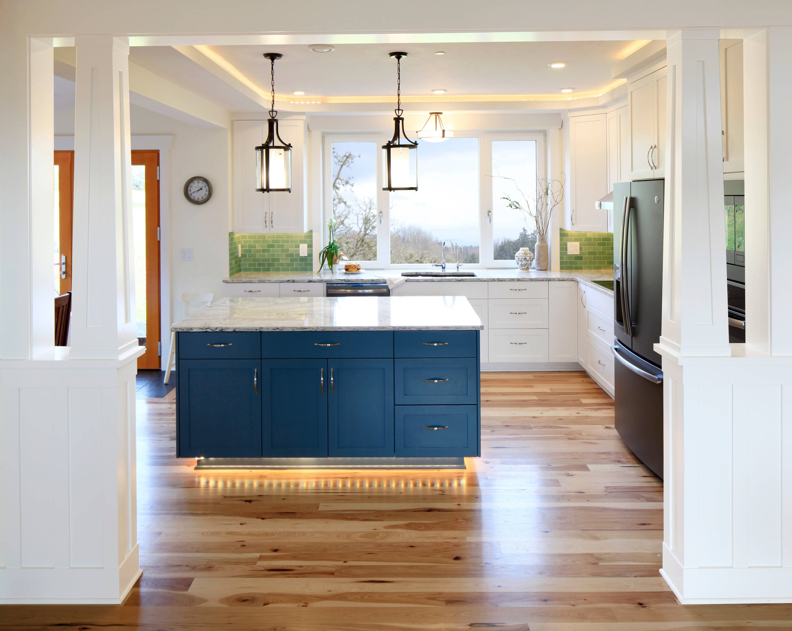 Kitchen. This Seattle Craftsman the couple spied on Houzz inspired some of the color scheme and millwork, including these columns flanking the wide opening between the living room and the kitchen. This kitchen inspired the color scheme and introduced them to the backsplash tile they used.
