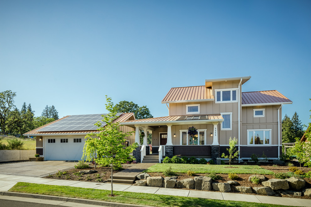 The photovoltaic panels atop the garage and front porch are a clue that this new-build Oregon house is no ordinary home when it comes to energy efficiency. “My wife Julie and I wanted to demonstrate the advantages of passive house concepts that I was learning about to our community and the other builders in Corvallis,” says builder-homeowner Carl Christianson. The couple also wanted to make this their family’s forever home.