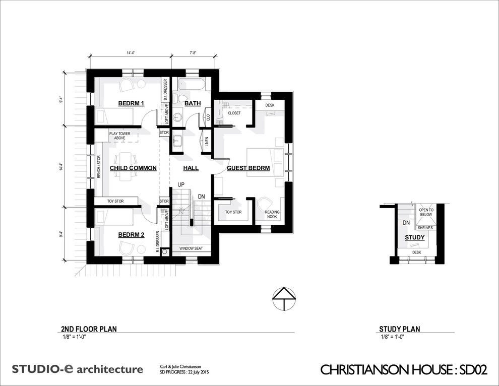 Second-floor plan. Here’s a look at the floor plan upstairs. Julie and Carl chose to shrink the upstairs bedrooms to make room for a playroom with a vaulted ceiling for the kids. To the right of the plan you can also see that they added a landing at another half-story up for an office nook with a view.