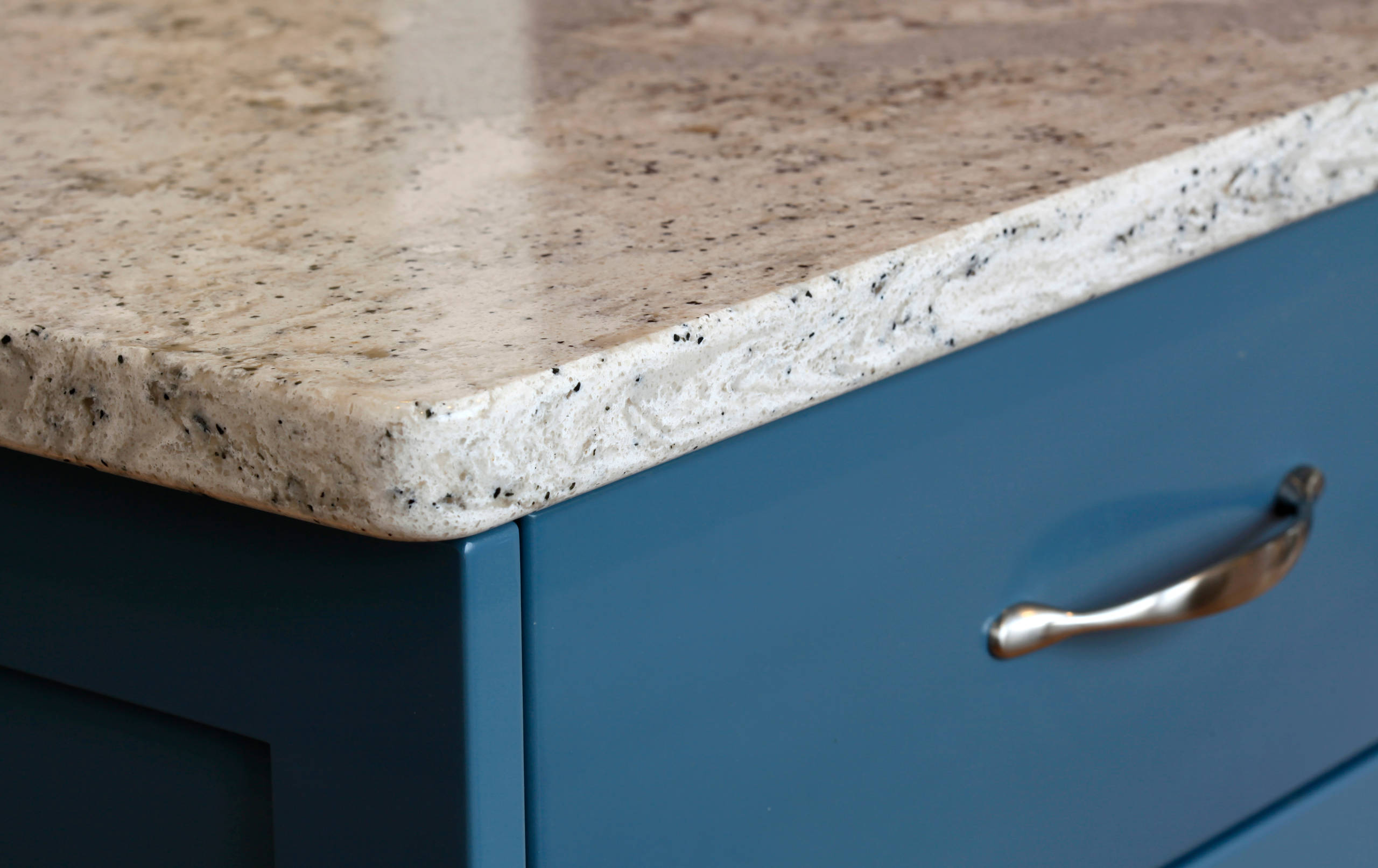 Countertops. The quartz countertops have veining with flecks of blue and green in it. “It will last a lifetime,” Carl says.