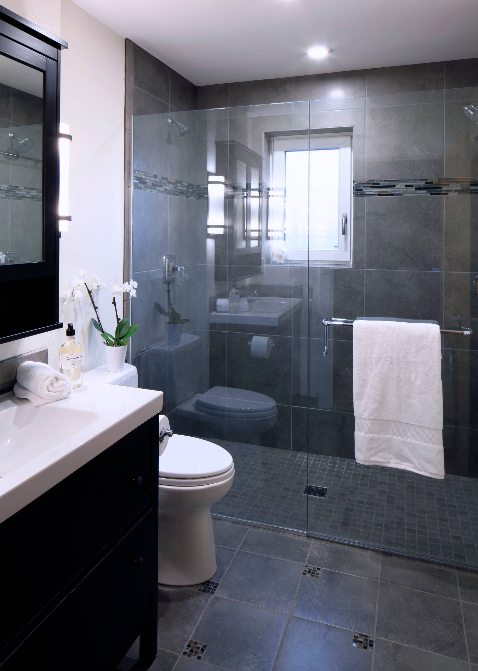 Stone and glass accent tile add flourishes to the shower walls and the floor. The shower head was a Kickstarter find from a company called Nebia. “It only uses 1 to 1½ gallons per minute,” Carl says. “It atomizes the water so it feels like a high-pressure shower head.”