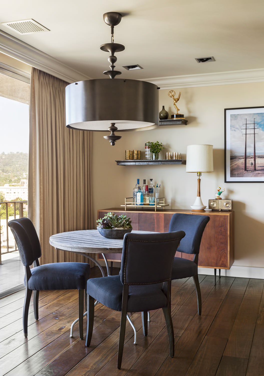 Tennant stained the existing poplar floors. He added a light fixture that’s the same dimension as the round table underneath it, a decision made with an eye toward the future when the client gets a larger table. “I didn’t want the light to be undersized when there’s a bigger table below it,” Tennant says.