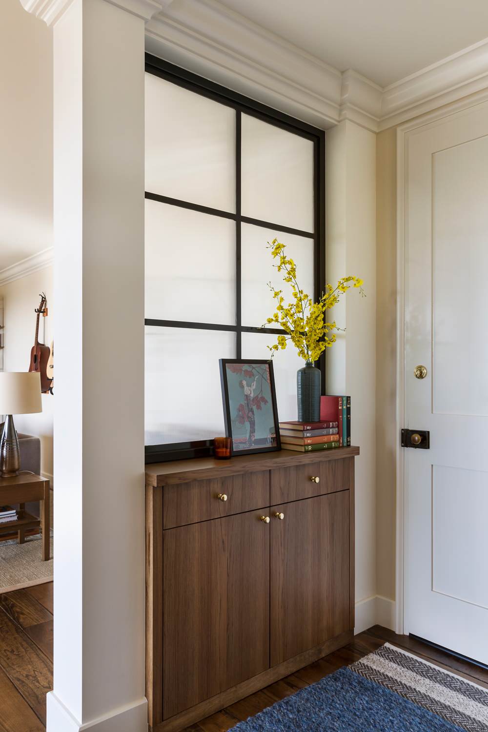 In the original layout the front door opened immediately into the living room. Tennant created a foyer, shown here, by adding a column and an interior window with frosted glass. A built-in cabinet with drawers stores keys and other items.