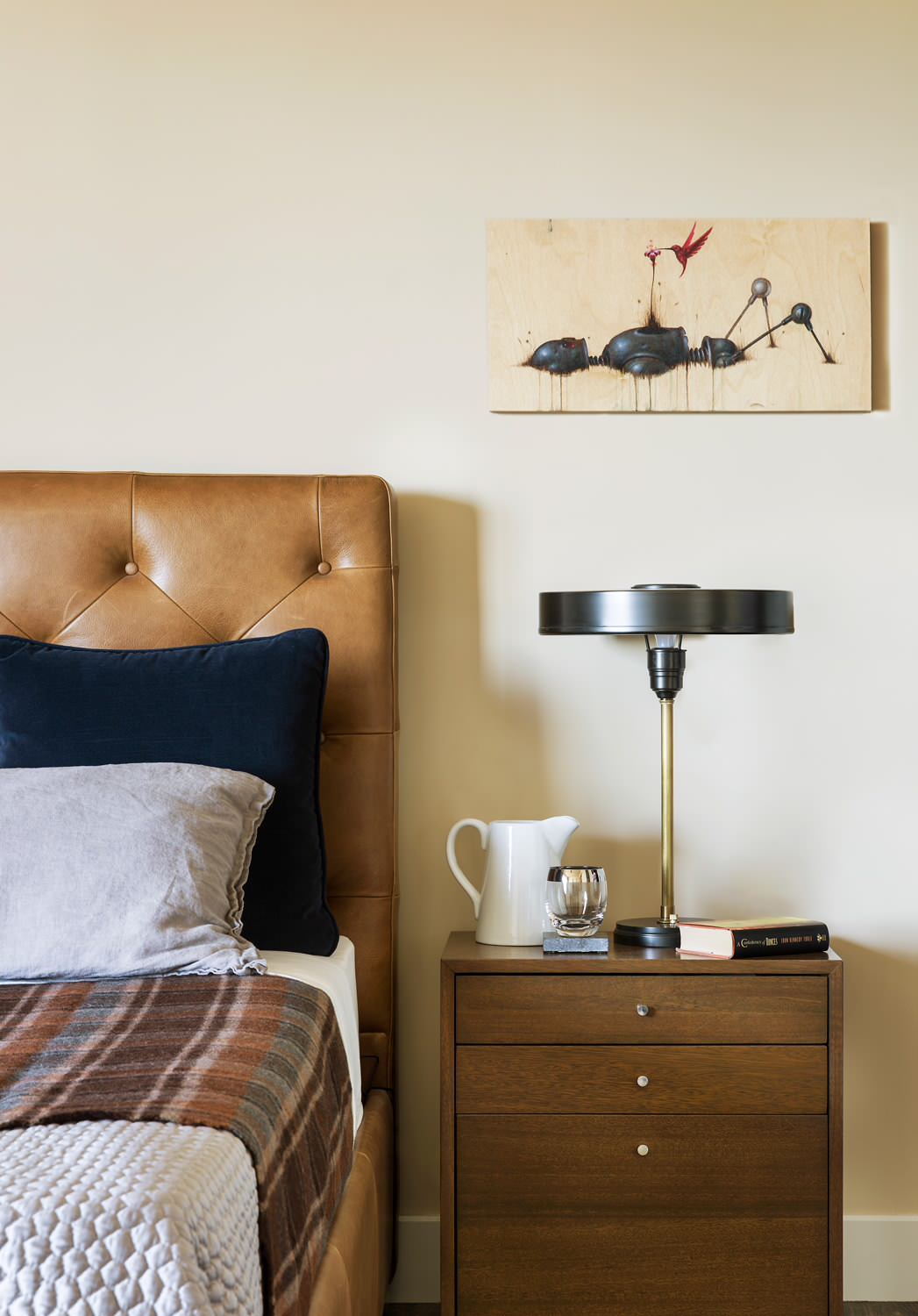 “We kept it really simple” in the master bedroom, Tennant says, with a leather headboard and a vintage 1950s bedside table. The lamp “feels midcentury but also 1920s industrial Deco,” he adds. The robot art already belonged to the client.