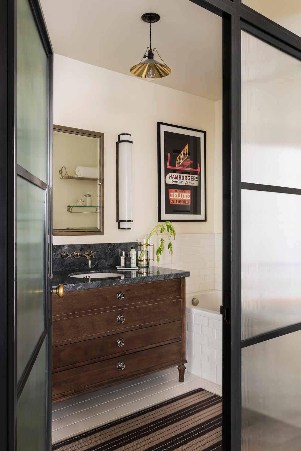 Before the remodel, the master bathroom was defined by pink marble, brass fixtures and a huge spa tub. Tennant ripped all that out and took down the wall on one side, replacing it with a steel-and-glass side panel with a door. Now it “doesn’t feel like an interior bathroom, because it gets so much light,” Tennant says. He added a deep soaker tub, classic white subway tile and a new vanity and medicine cabinet.