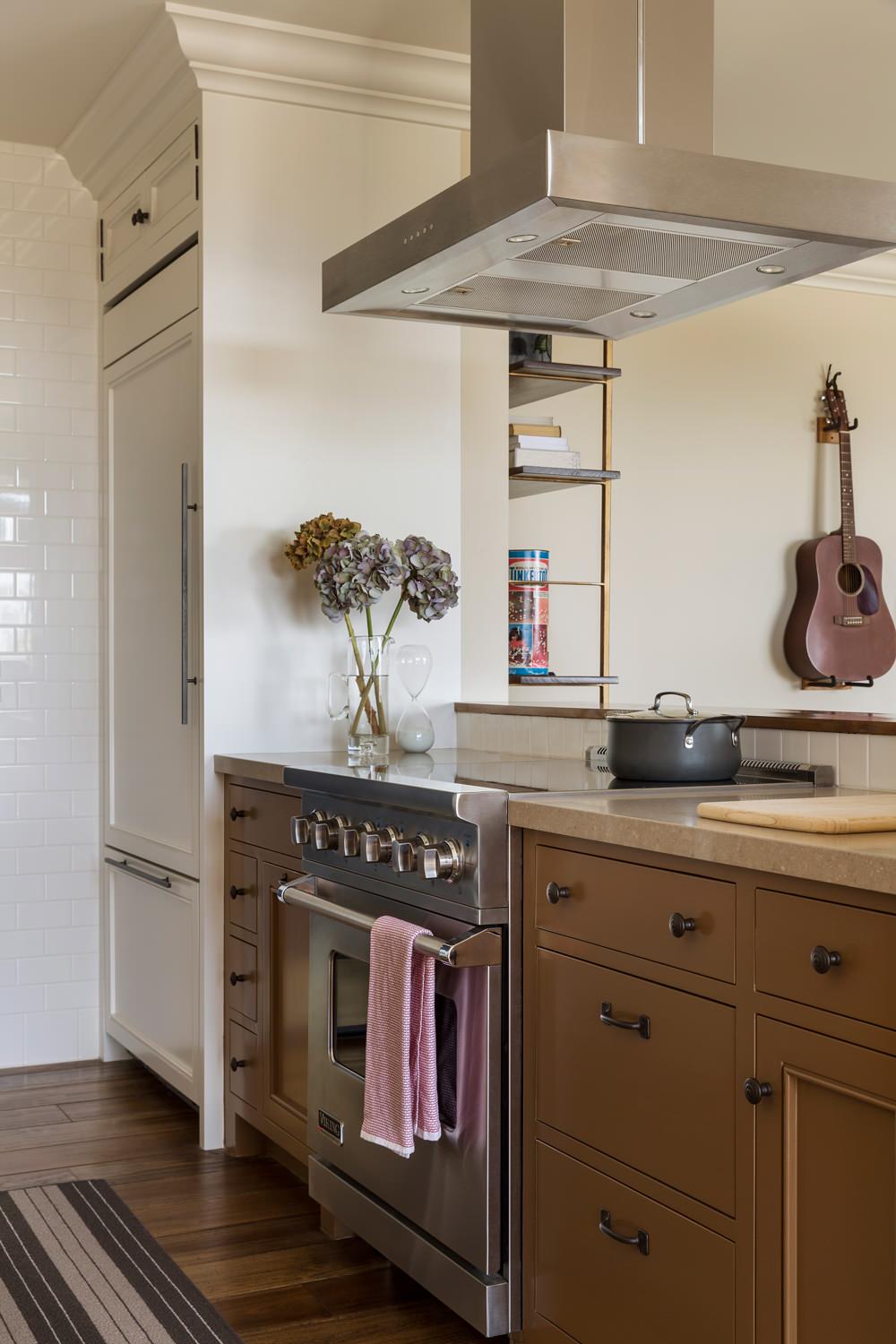 In the living room, Tennant and architect Tim Barber considered hanging a large art piece on the wall behind the sofa. “Then we realized [the homeowner] has all these beautiful musical instruments,” Tennant says. They thought, “Why don’t we make those into art?”