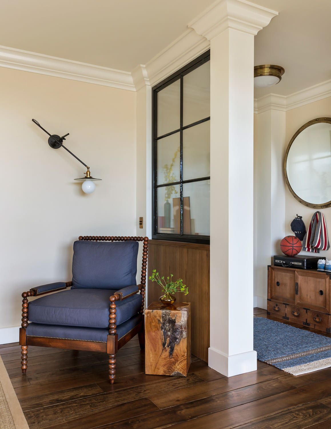 The frosted, ribbed glass in the window creates a delayed reveal as you come around the corner. The mirror in the entry reflects light and is “practical, so you can check yourself before you leave the house,” Tennant says. A reading nook includes a wall sconce and a burl wood side table infused with acrylic.