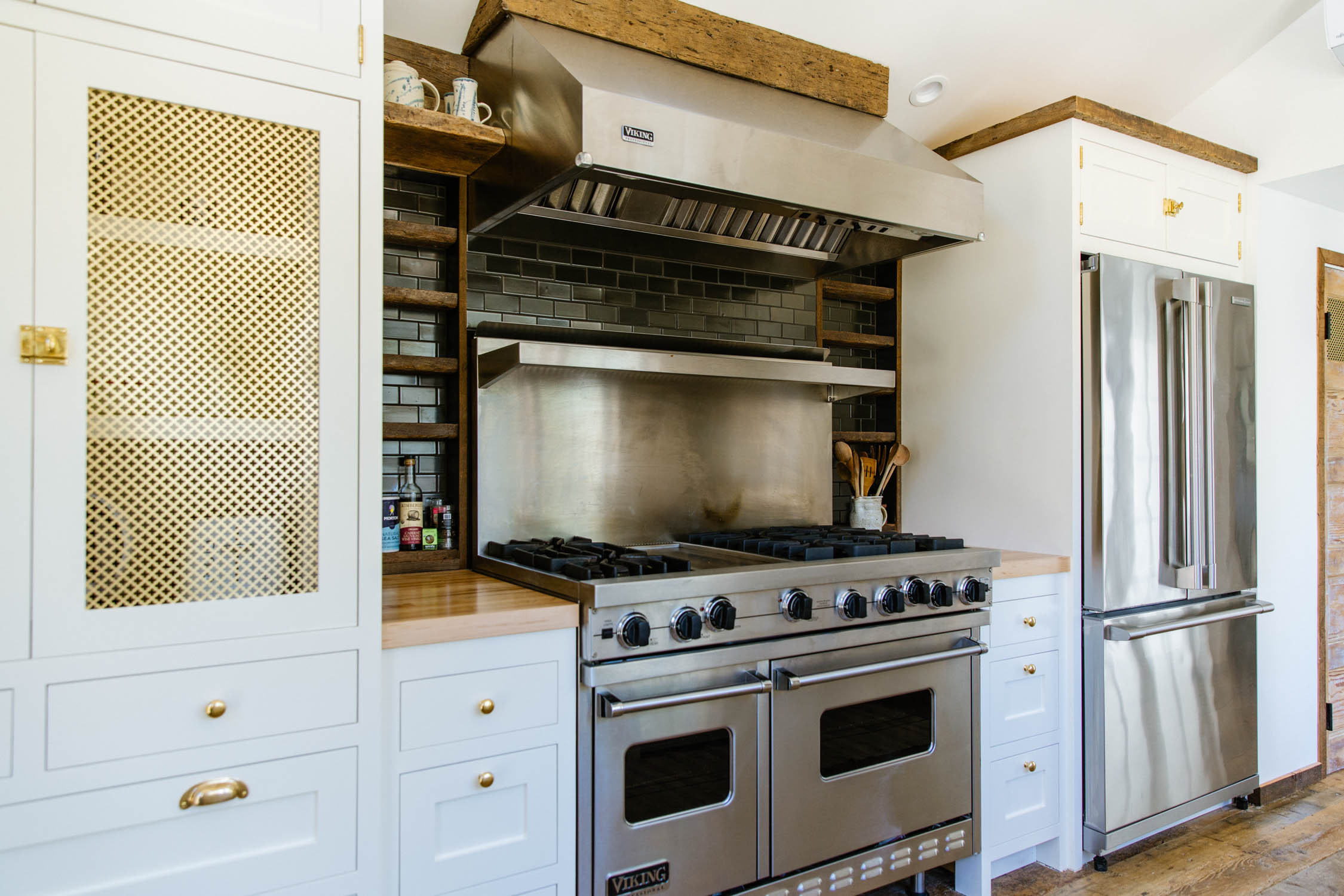 Howell also selected details like the cabinetry with brass mesh cabinet door inserts, the black tile backsplash and many of the rustic wood accents.
