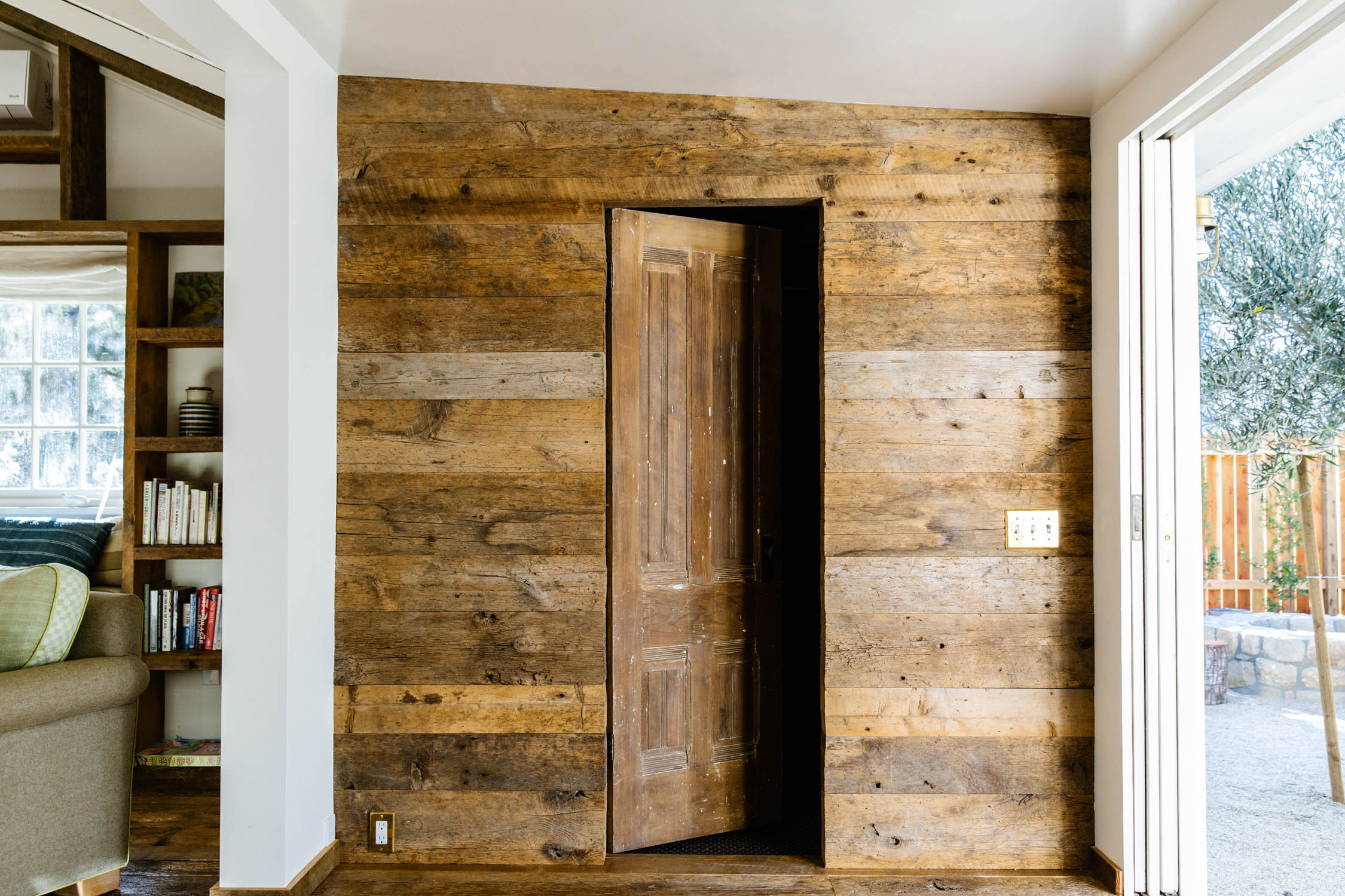 The opening to the right of the barnwood wall is a 6-foot-wide reclaimed sliding pocket door collected by Lewis. (If you look back at the first photo, they’re the partly opened doors on the far right.)