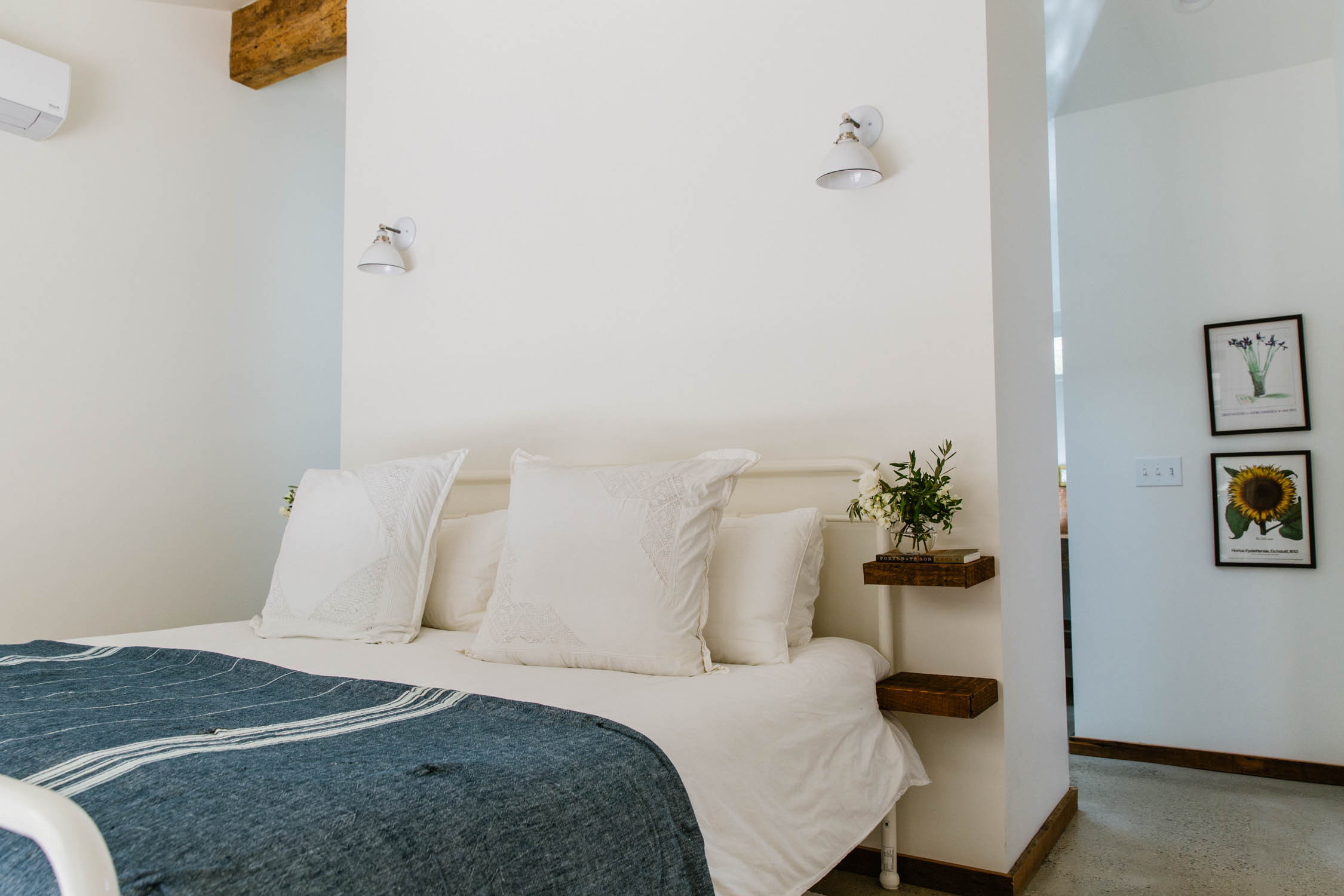 The primary bedroom’s simple white walls, white enamel sconces and white iron bed (all selected by Howell) are foils for the reclaimed-wood shelves and rustic ceiling beam.