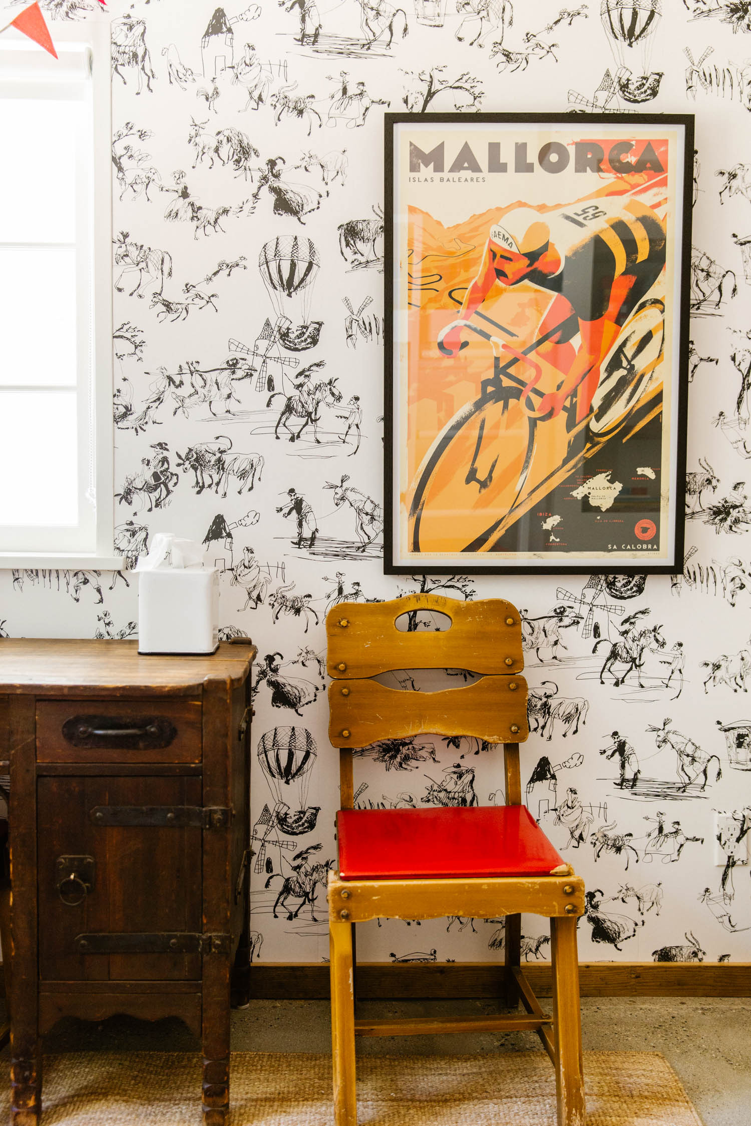 Howell, who has children of her own, saturated the room with character, styling it with Don Quixote-esque wallpaper, a vintage wood chair and a 1960s-era travel poster from Mallorca, Spain.