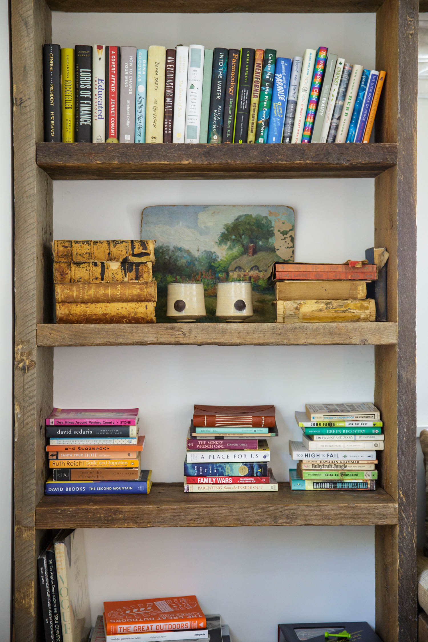 One is discreetly installed in the triangle in the top of the bookshelves and the built-in reading bench, which were made from the rough-hewn barnwood.