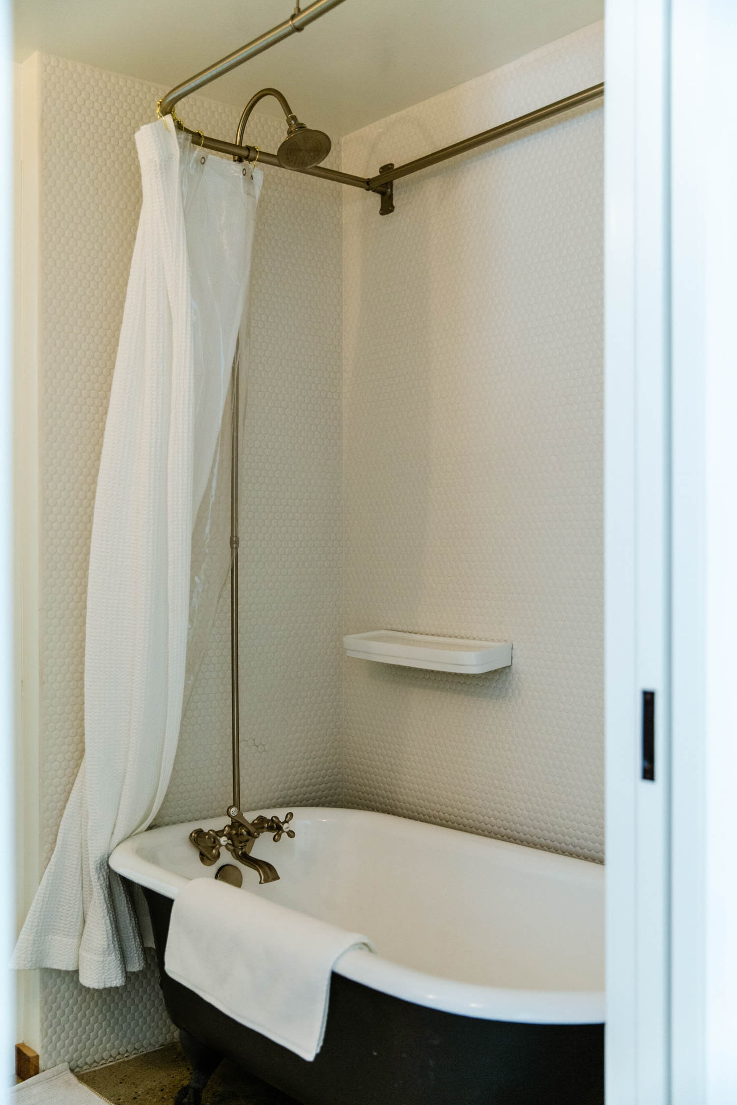 The penny tile continues around the original black-and-white claw-foot tub with vintage-style brass fixtures.