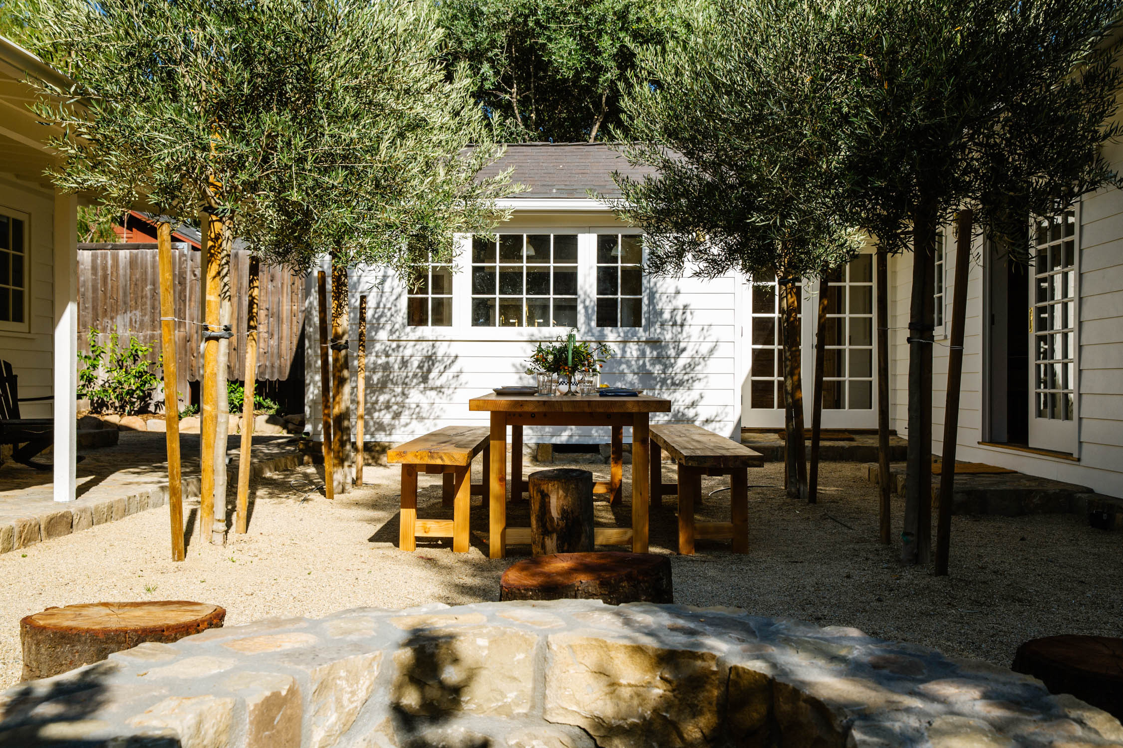 Howell added the courtyard’s gravel and olive trees, as well as a beautiful dining table made with fallen trees by local woodworker Jackie Stewart.