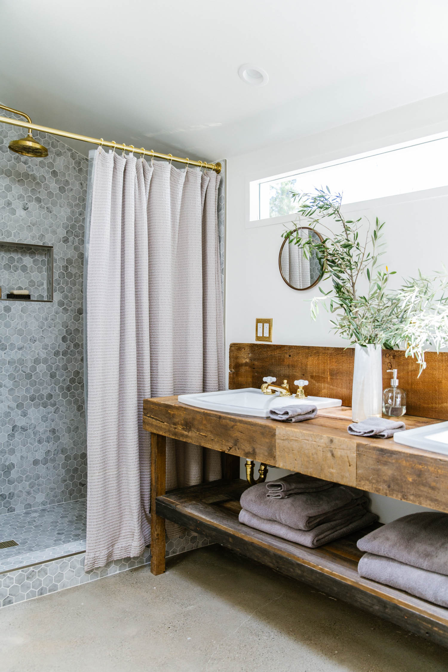The double vanity is also made of rough-hewn wood. Brass fixtures and hexagonal marble shower tiles elevate the humble material.