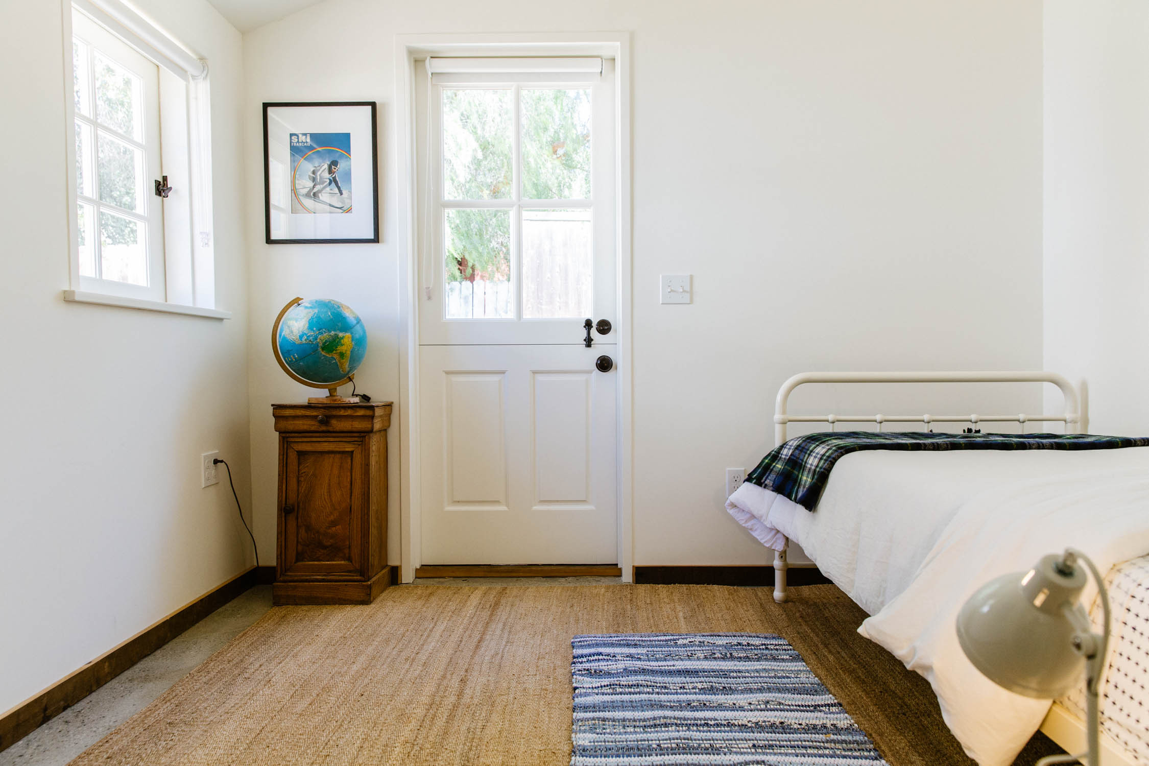 Another set of salvaged and re-engineered sliding glass doors leads to the primary bedroom.