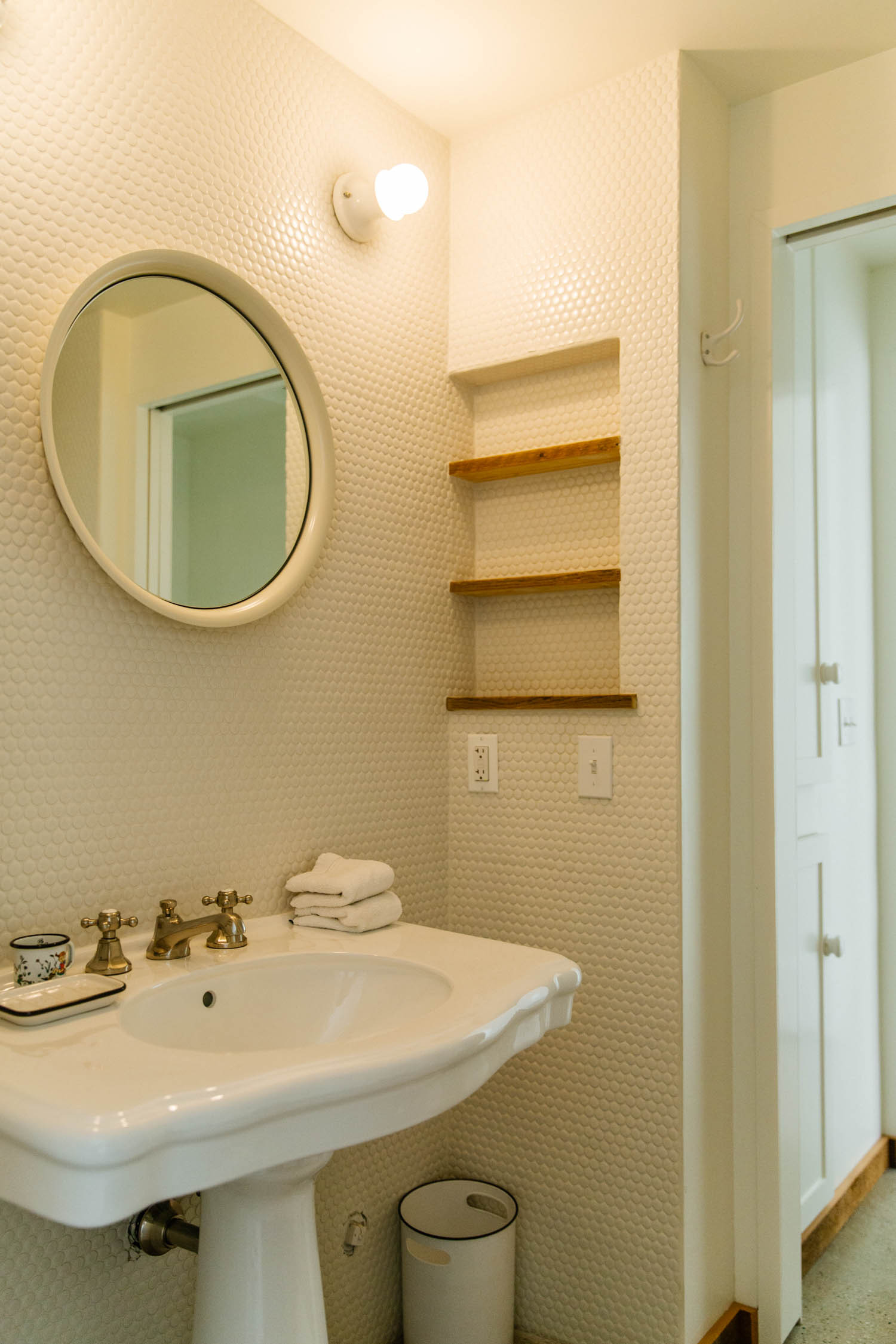 A second bathroom has penny tile walls, a pedestal sink and simple sconces.