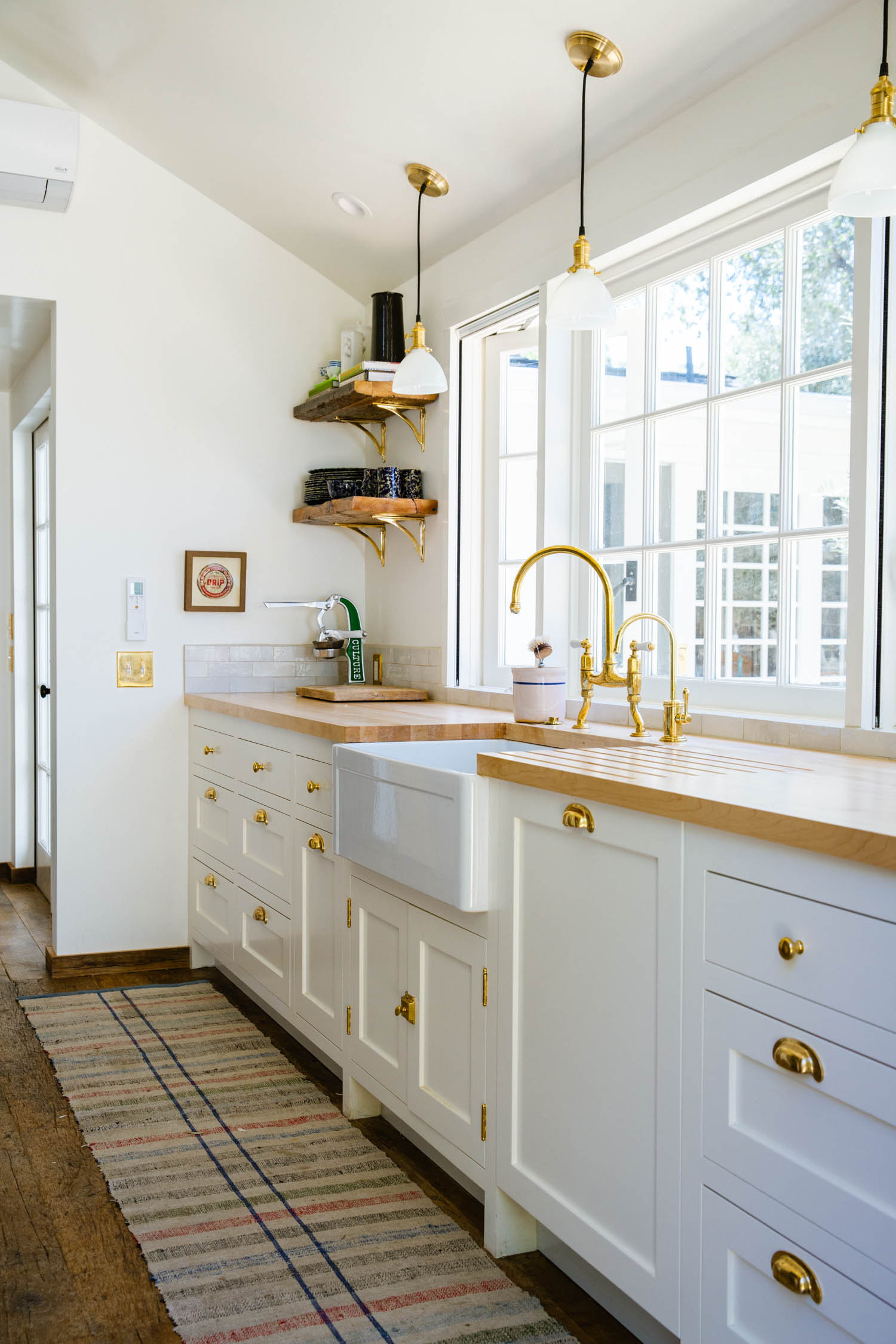 Lewis originally wanted the kitchen to have a Moroccan feel with concrete countertops. But after purchasing the home, Howell installed a kitchen with a more traditional design, including white Shaker-style cabinetry, a farmhouse sink, cup pulls and butcher block countertops with an integrated drainboard.