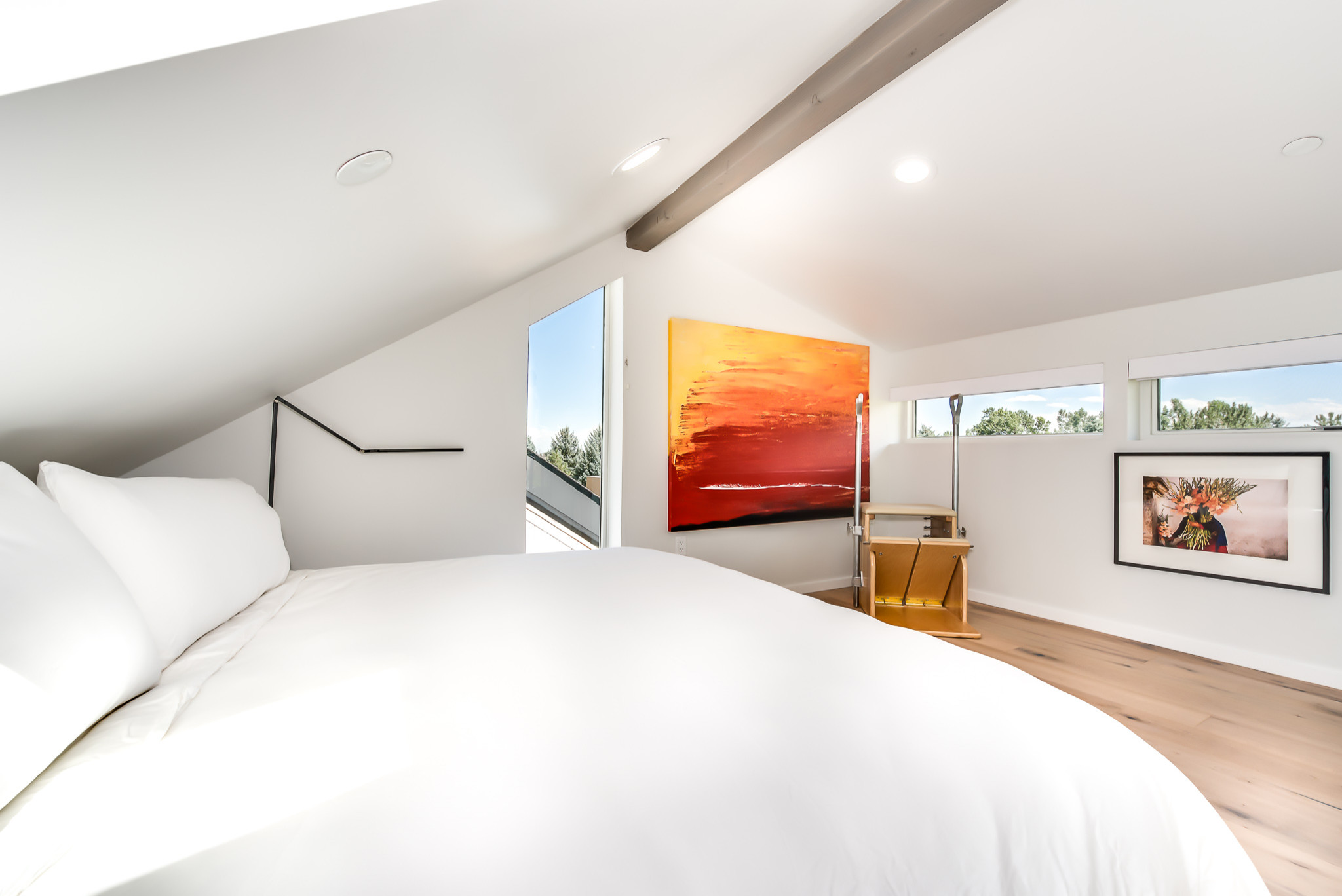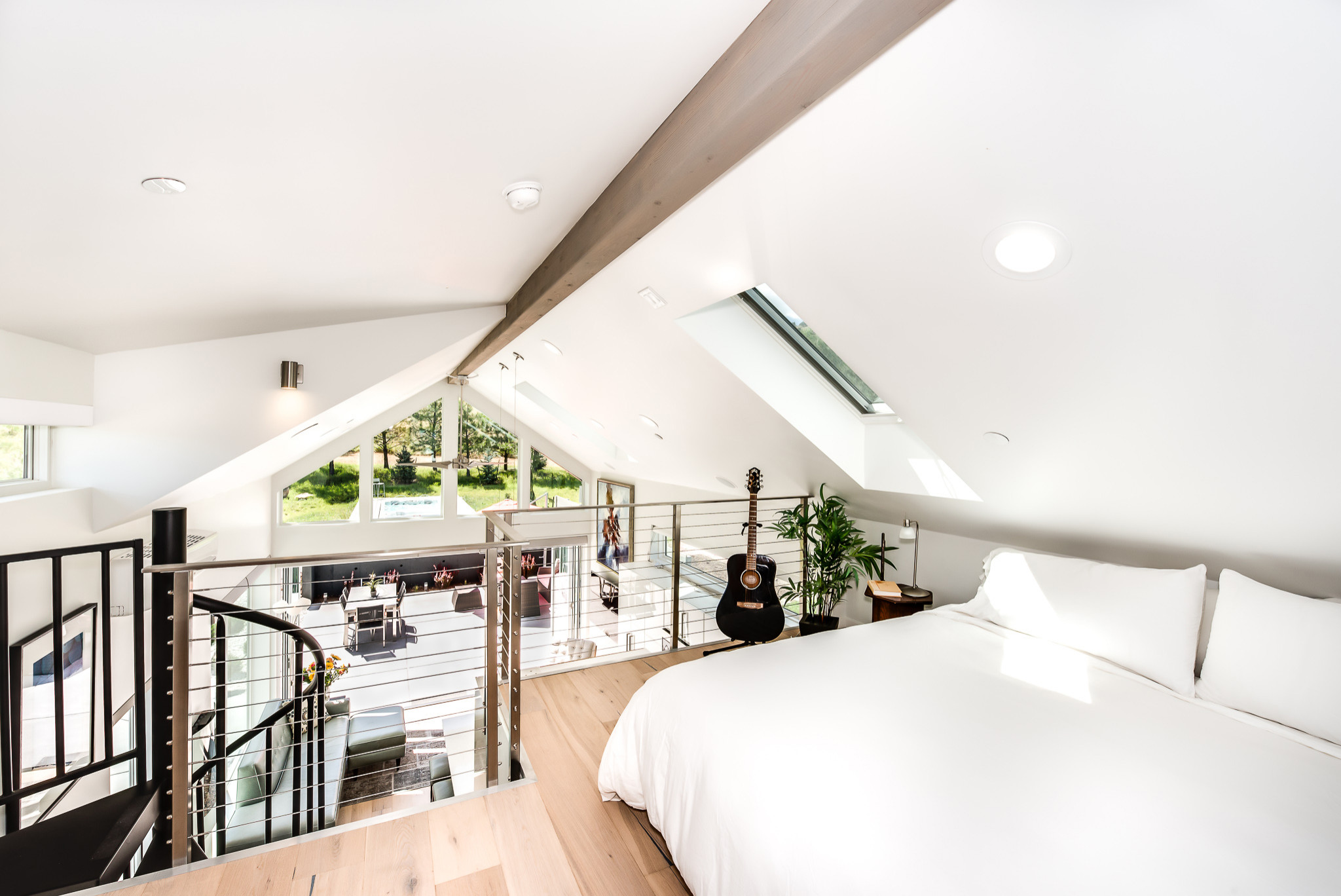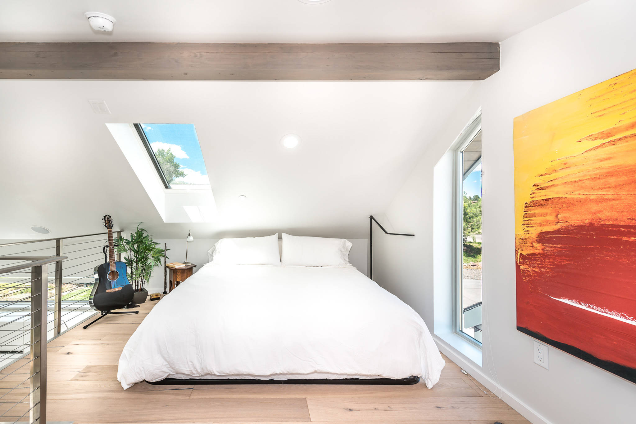 A skylight and clerestory windows give the loft bedroom a modern treehouse feel. A gray-stained PSL, or parallel strand lumber, ceiling beam breaks up the stark white walls and ceiling. The same stain was used for the exterior wood on the patio.
