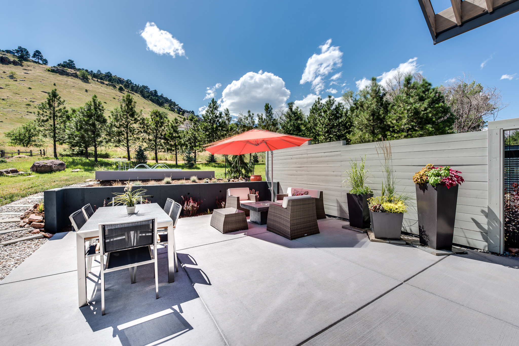 The deck extends the living space outdoors, with adjacent hillside views. The concrete deck and contemporary pottery and patio furniture are right in line with the homeowners’ taste, yet still in keeping with neighborhood design requirements.