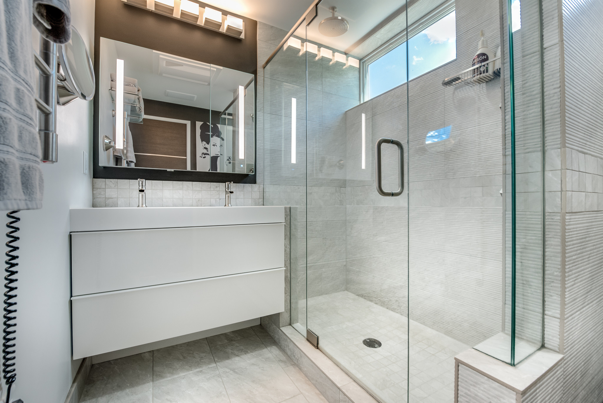 The three-quarters bathroom with radiant floor heating is located behind the kitchen, below the sleeping loft. Clerestory windows bring light into the space, which also has a surprisingly spacious step-in shower.